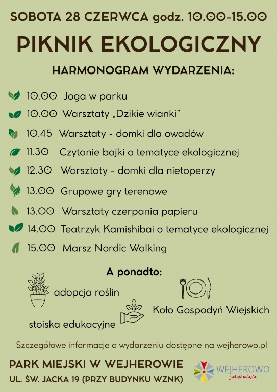 Podczas Pikniku Ekologicznego będzie stanowisko szachowe, medyczne i pyszności przygotowywane przez koło Gospodyń Wiejskich. Policja przeprowadzi rozmowy o bezpieczeństwie w ruchu drogowym, a wejherowska Straż Miejska – o działaniach edukacyjnych w dotyczących naszego najbliższego otoczenia i konieczności sprzątania po swoim psie.