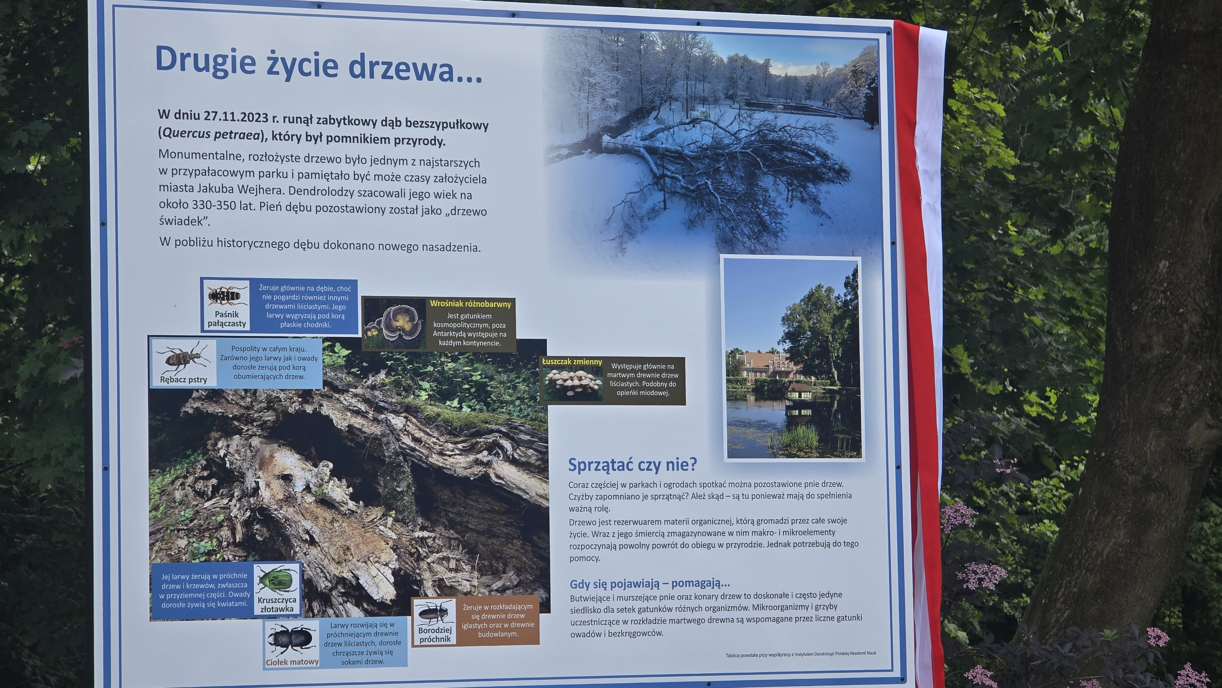 — Został nasadzony dąb szypułkowy. Powstała również tablica edukacyjna informująca o tym, dlaczego fragmentu powalonego dębu pozostanie w parku przez najbliższe lata - zaznacza Aleksandra Sielicka, p.o. dyrektora Muzeum Piśmiennictwa i Muzyki Kaszubsko-Pomorskiej w Wejherowie.