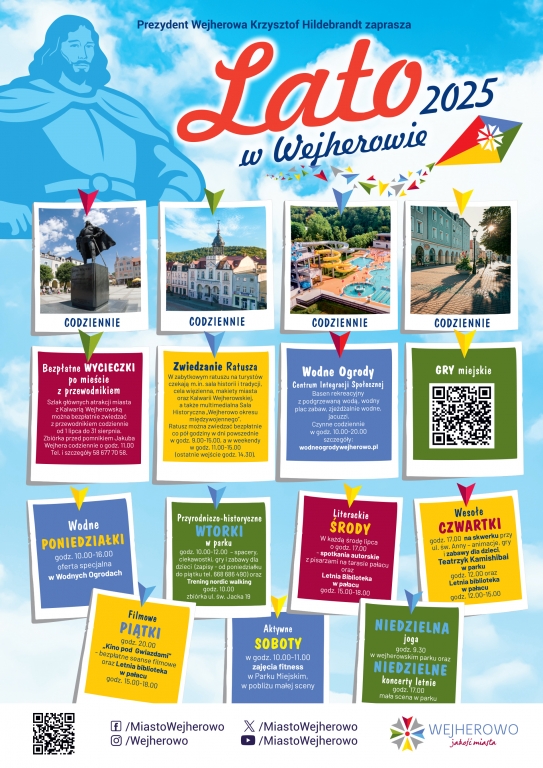Mieszkańcy Wejherowa i odwiedzający miasto goście będą mogli skorzystać z wielu propozycji, z których każdy może wybrać coś dla siebie: koncerty i jogę w parku, kino plenerowe, bezpłatne wycieczki z przewodnikiem po mieście, zwiedzanie Ratusza, letnią bibliotekę w parku czy literackie środy w parku.