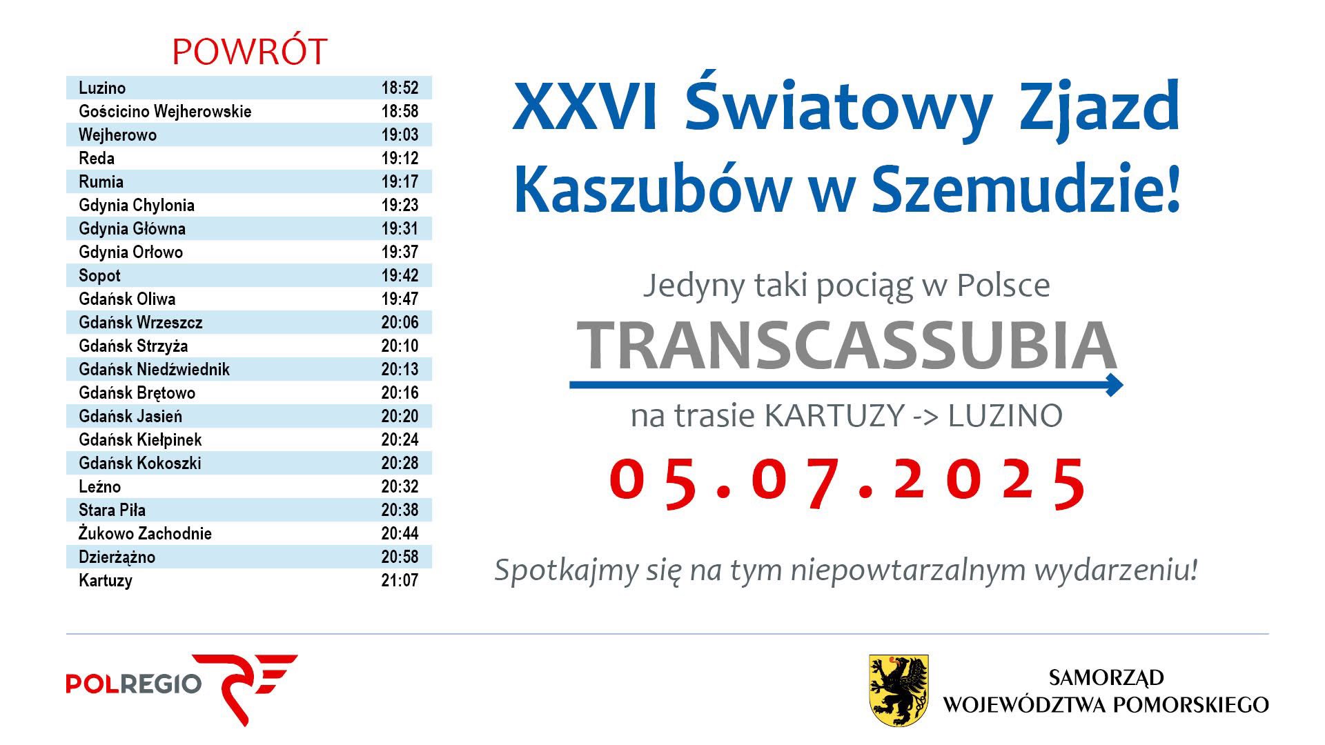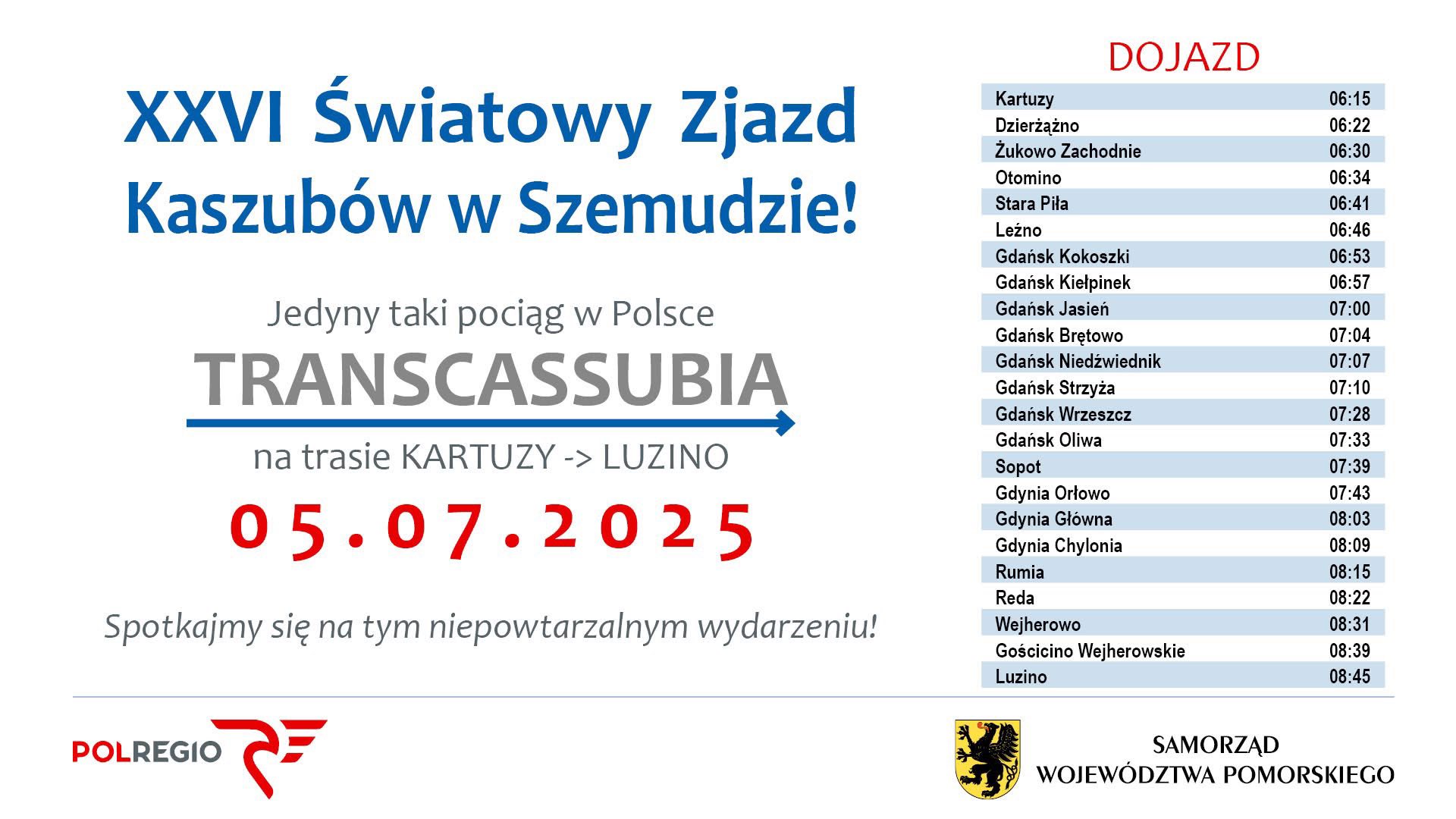 Tradycyjnie na wydarzenie będzie można przybyć pociągiem TRANSCASSUBIA. Pociąg wyruszy z Kartuz i dotrze do Luzina. Stamtąd podróżni pojadą do Szemudu autobusami. Powrót zaplanowany jest w tym samym schemacie.