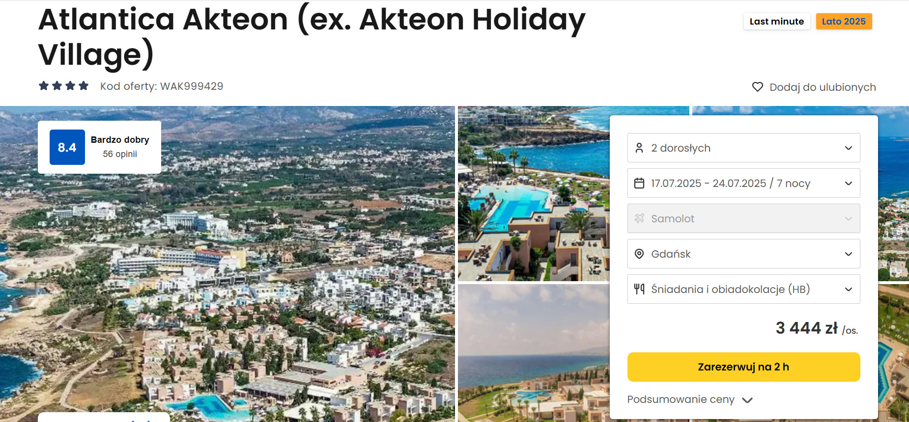 Hotel Atlantica Akteon od lat cieszy się popularnością wśród Klientów. Jego największe atuty to wysoka jakość usług oraz doskonała lokalizacja. Obiekt położony jest w nadmorskiej miejscowości Chloraka, zaledwie 5 km od centrum Pafos, tuż przy samej linii brzegowej. To idealna baza wypadowa zarówno do relaksu nad morzem, jak i do zwiedzania okolicznych atrakcji. W bliskiej odległości znajdują się jedne z najciekawszych miejsc na wyspie – zaledwie 3 km dzielą hotel od słynnych Grobowców Królewskich, a w odległości ok. 5 km znajduje się malowniczy port w Pafos oraz imponujące stanowisko archeologiczne, wpisane na listę UNESCO. Cena za osobę z dwoma posiłkami to 3 444 zł.