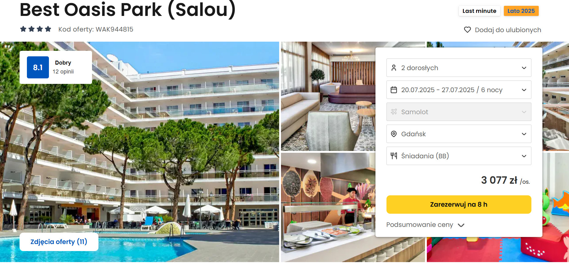 Hotel Best Oasis Park na Costa Dorada to sprawdzona i lubiana propozycja klientów, idealna zarówno na rodzinne wakacje, jak i romantyczny wyjazd we dwoje. Ten komfortowy, 4-gwiazdkowy obiekt należący do renomowanej sieci Best oferuje przestronne pokoje, bardzo dobre jedzenie oraz doskonałą lokalizację. Goście doceniają przede wszystkim bliskość plaży, spokojną atmosferę i świetne zaplecze rekreacyjne. Dla miłośników aktywnego wypoczynku i rodzin z dziećmi atutem będzie położenie w niedalekiej odległości od PortAventura World – największego parku rozrywki w Hiszpanii. Z kolei osoby spragnione miejskich atrakcji mogą w łatwy sposób zorganizować wycieczkę do Barcelony lub odwiedzić zabytkową Tarragonę. Cena za osobę dorosłą 20 lipca z wylotem z Gdańska to 3 077 zł.