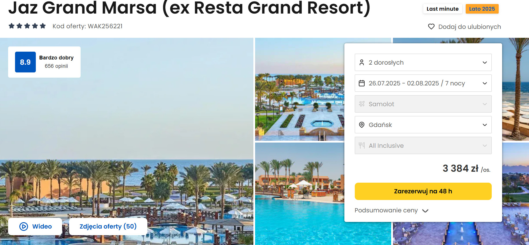5-gwiazdkowy Jaz Grand Marsa to propozycja na wakacje, którą klienci cenią za wysoki standard, profesjonalną obsługę i wyjątkowe położenie tuż przy rafie koralowej. Ten luksusowy hotel w Marsa Alam oferuje komfortowe pokoje, kilka basenów, bogaty program animacji oraz dostęp do prywatnej plaży – wszystko to sprawia, że jest idealnym miejscem zarówno dla rodzin z dziećmi, jak i par szukających spokojnego wypoczynku. Szczególnie doceniane są także smaczne posiłki w formule all inclusive oraz możliwość nurkowania i snorkelingu bezpośrednio z plaży. Cena za osobę z all inclusive w terminie 26 lipca z wylotem z Gdańska to 3 384 zł.
