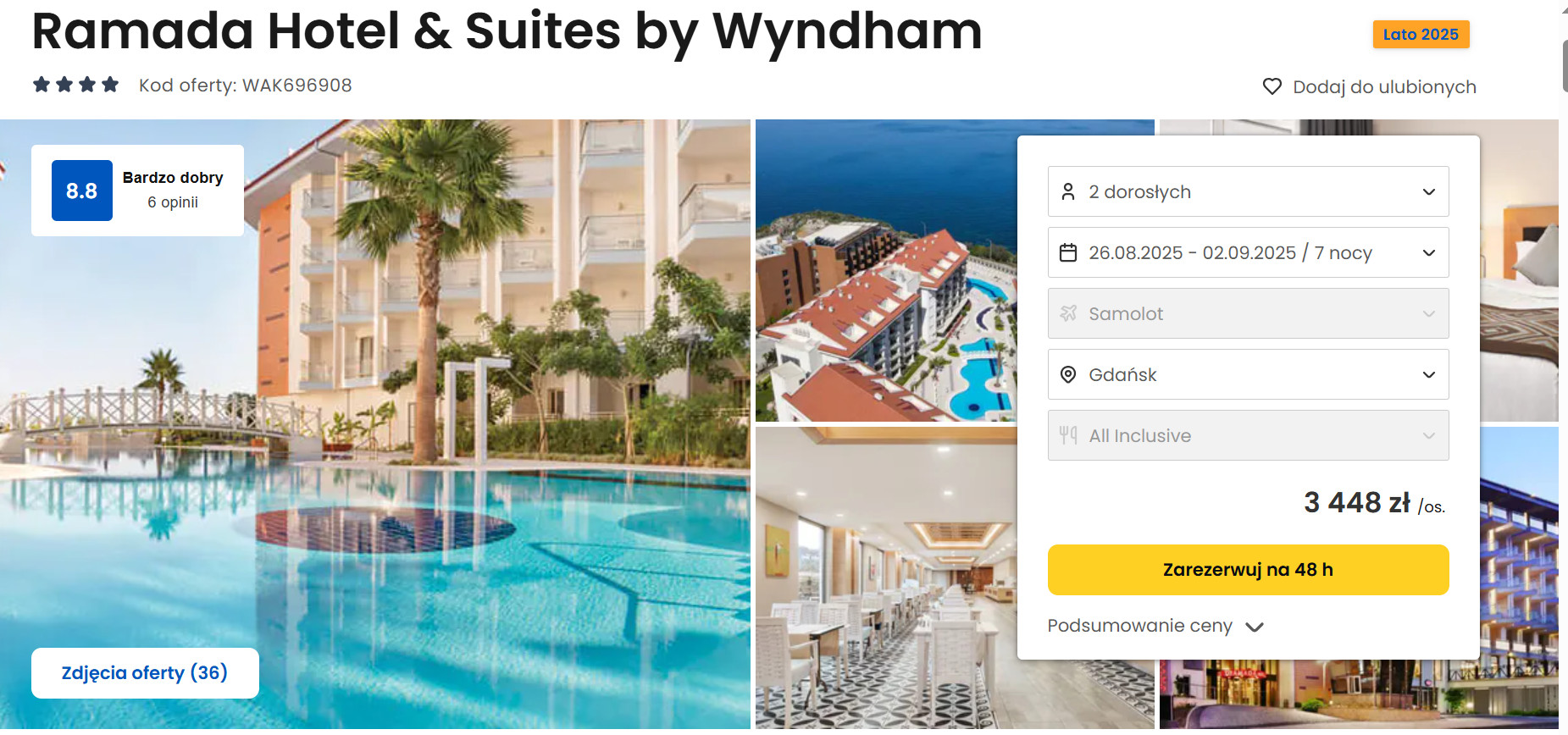4-gwiazdkowy hotel Ramada to nasza propozycja last minute dla rodzin z dziećmi, ale również dla podróżujących w parach. Tu każdy znajdzie przestrzeń odpowiednią dla siebie. Dzieci do swojej dyspozycji mają basen ze zjeżdżalniami, a pary spokojne zakątki przy basenie głównym. All inclusive oferuje bardzo smaczne i zróżnicowane posiłki, podczas których ciężko będzie o nudę. Polecamy ten hotel w tej cenie! Najlepsza cena w tym hotelu z all inclusive za osobę z wylotem z Gdańska to 3 448 zł/os.