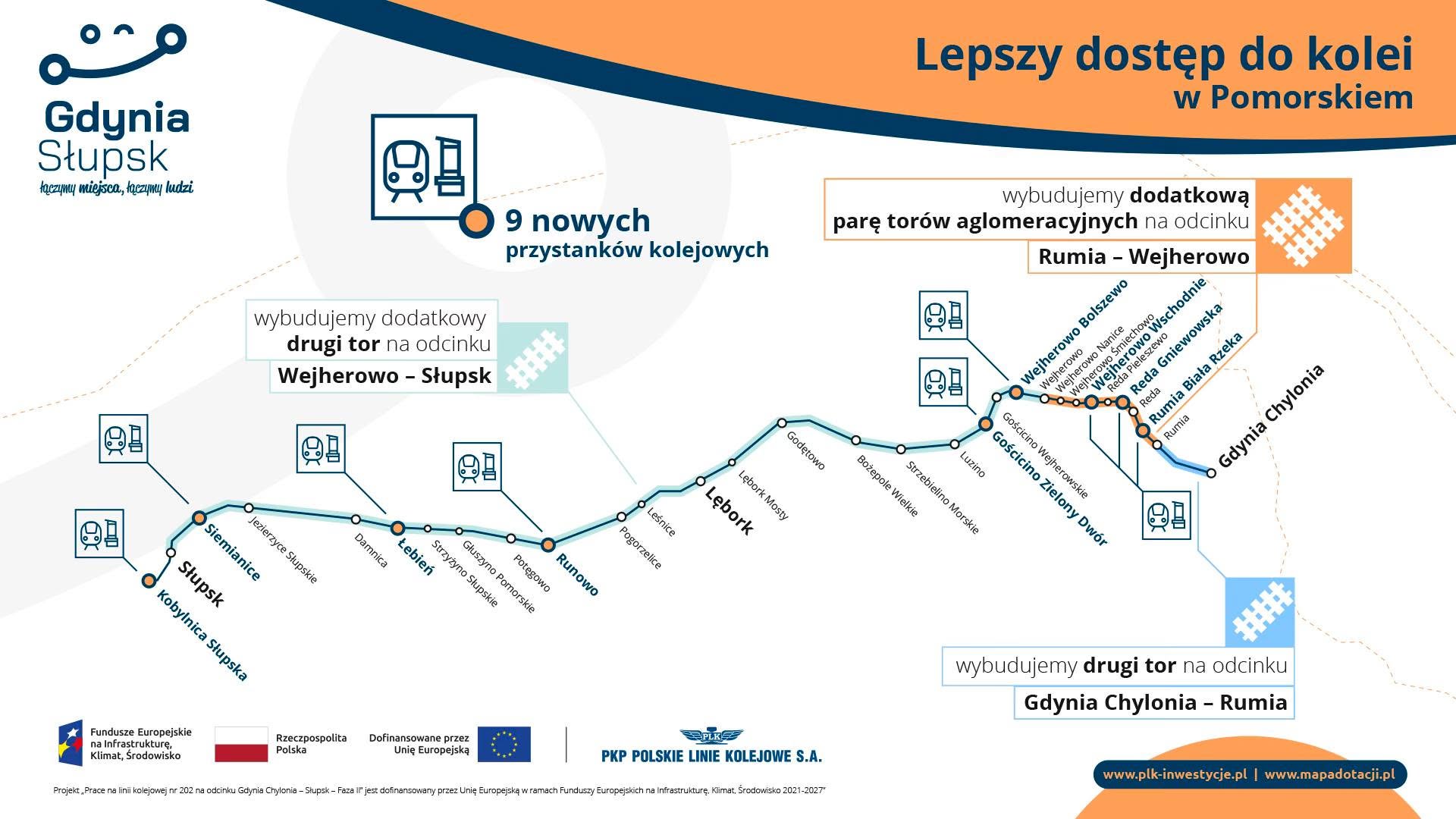 — W ramach prac na linii nr 202 przebudujemy wszystkie przystanki i stacje na trasie, co znacząco poprawi komfort obsługi podróżnych - przekonuje Przemysław Zieliński z zespołu prasowego PKP Polskie Linie Kolejowe S.A. - Zapewnione zostaną wygodne dojścia także dla osób o ograniczonych możliwościach poruszania się. Powstaną także nowe przystanki, które zwiększą dostęp do kolei w tej części województwa pomorskiego. Na tory będzie mogło wyjechać więcej pociągów. Lepszą przepustowość trasy i dojazdy do aglomeracji trójmiejskiej zapewnią drugi tor na odcinkach Gdynia Chylonia – Rumia, Wejherowo – Lębork - Słupsk oraz dwa tory tzw. aglomeracyjne na odcinku Rumia – Wejherowo jako przedłużenie linii kolejowej nr 250. Prace obejmą również przebudowę sieci trakcyjnej, torów i obiektów inżynieryjnych, co przełoży się na sprawne podróże pociągiem. Poziom bezpieczeństwa na styku dróg i torów zwiększy się dzięki zastąpieniu przejazdów kolejowo – drogowych skrzyżowaniami bezkolizyjnymi - podkreśla Zieliński.