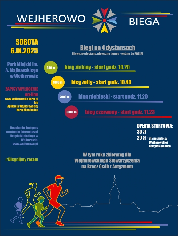 Tegoroczna edycja "Wejherowo Biega 2025" odbędzie się w sobotę, 6 września 2025 roku. W tym roku obowiązują wyłącznie zapisy przez stronę internetową www.wejherowskakarta.pl lub jej aplikację. Zapisy potrwają do 5 września r. do godz. 23:59 lub do wyczerpania limitów miejsc (900 miejsc). Opłata startowa wynosi 30 zł lub 20 zł – dla posiadaczy Wejherowskiej Karty Mieszkańca i dla Maluszka (do ukończenia 4 r.ż). Należy ją uiścić wyłącznie poprzez stronę internetową - nie będzie możliwości dokonania opłaty w biurze zawodów.