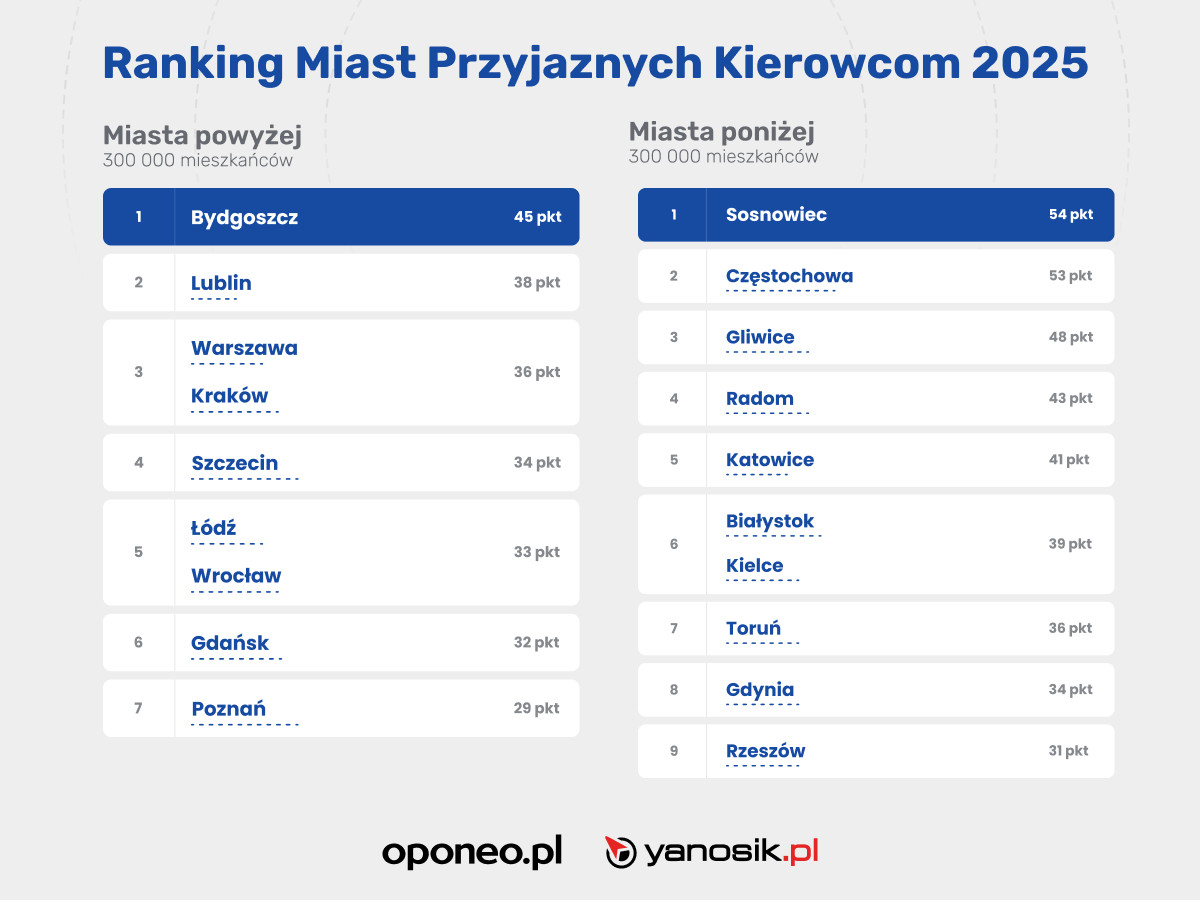 Gdańsk i Gdynia zajmują przedostatnie miejsca w Rankingu miast przyjaznych kierowcom 2025, przygotowanym przez Oponeo.pl i Yanosik. To już dziewiąta edycja zestawienia, w którym analizowane są dane z 19 największych miast, podzielonych na dwie grupy, powyżej oraz poniżej 300 tys. mieszkańców.