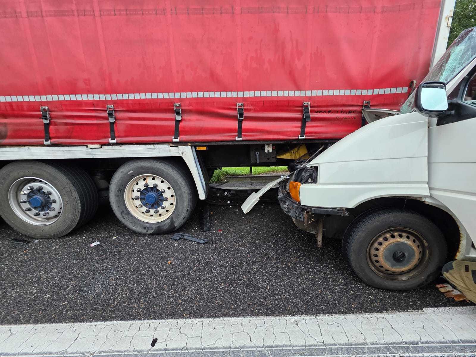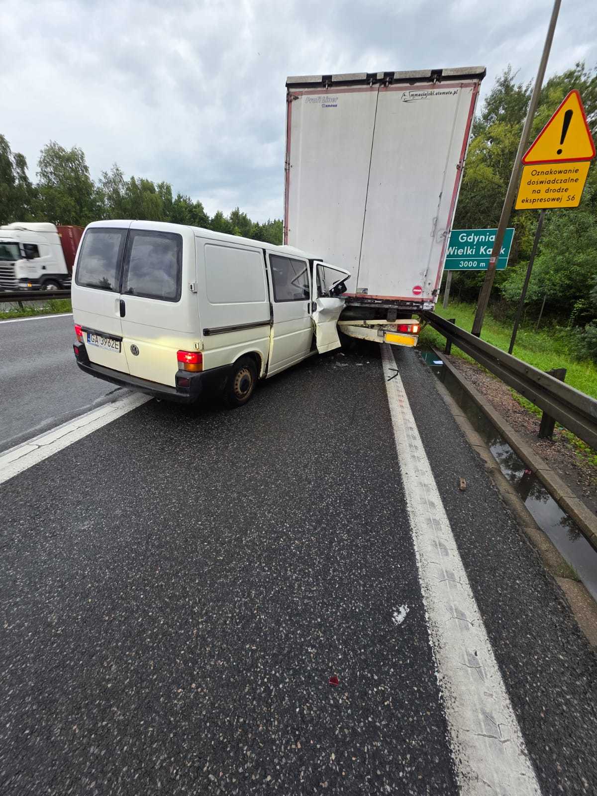 Do niebezpiecznie wyglądającego wypadku doszło na Obwodnicy Trójmiasta. Dostawczak wbił się w tył naczepy ciężarówki.