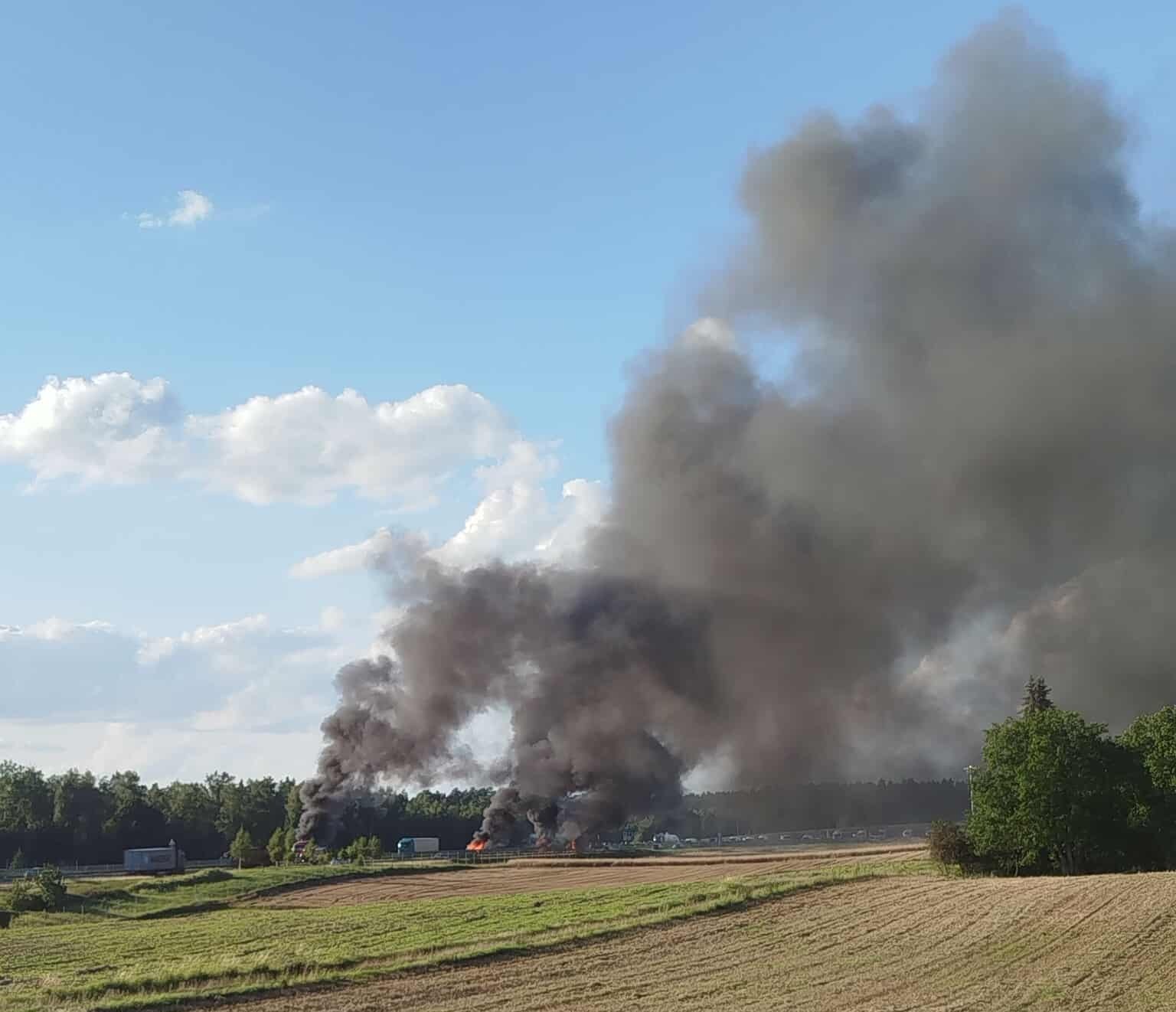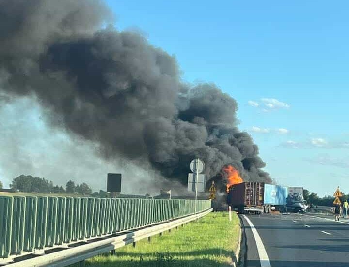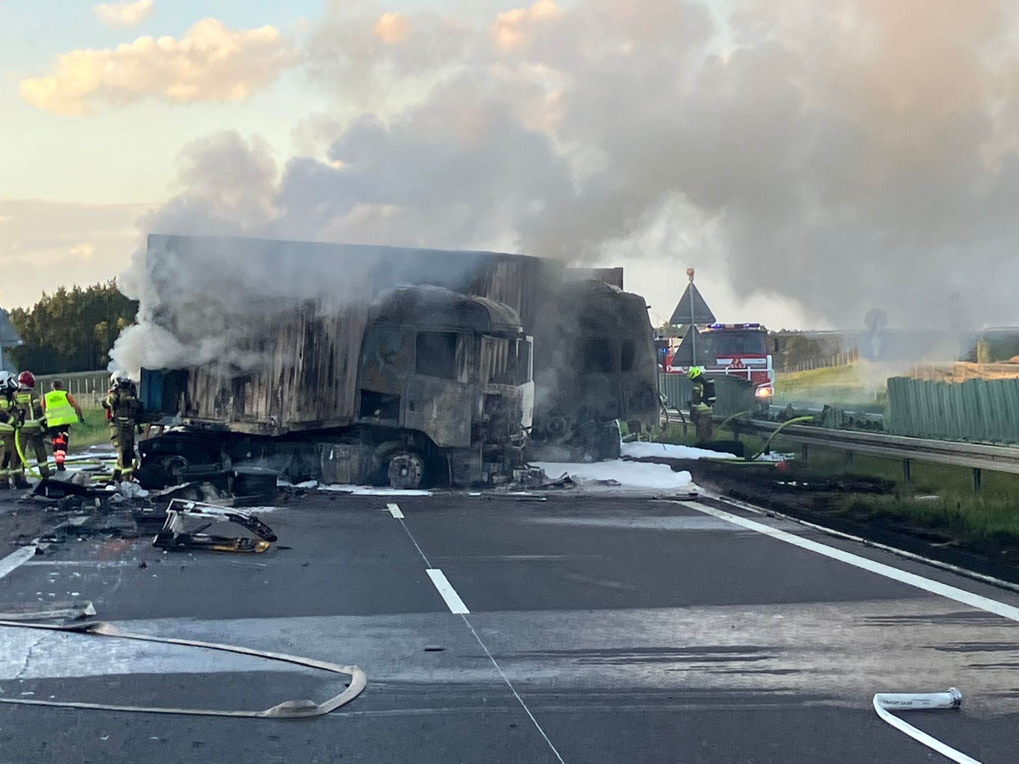 Na autostradzie A1 w kierunku Łodzi, na wysokości miejscowości Rombark, doszło do wypadku z udziałem trzech samochodów ciężarowych i busa. W zdarzeniu zginął jeden mężczyzna, a dwa pojazdy ciężarowe stanęły w ogniu.