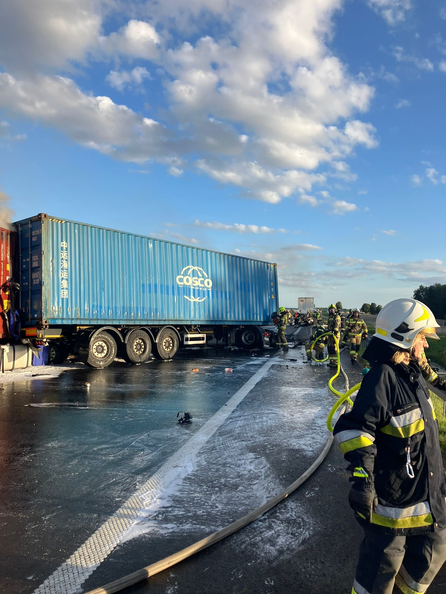W wyniku wypadku śmierć poniósł jeden mężczyzna. Dwa samochody ciężarowe zapaliły się. Na miejsce zadysponowano 10 zastępów straży pożarnej, kilka zespołów ratownictwa medycznego, w tym helikopter. Trwa ustalanie liczby poszkodowanych.