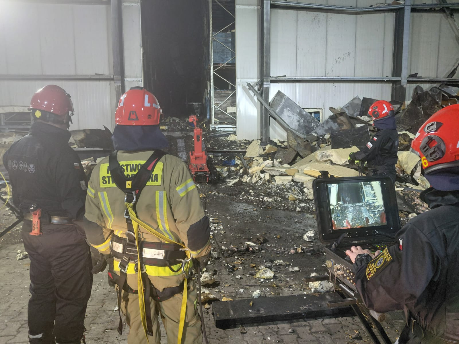 Strażacy do akcji wprowadzili także robota gaśniczego PSP, który wykonywał zadania wewnątrz obiektu objętego pożarem. Strażacy nadal schładzają elementy konstrukcyjne obiektu oraz zwalczają punktowe ogniska pożaru. Natomiast bezzałogowe statki powietrzne stale monitorują teren akcji oraz wykorzystywane są do prowadzenia szczegółowego rozpoznania.