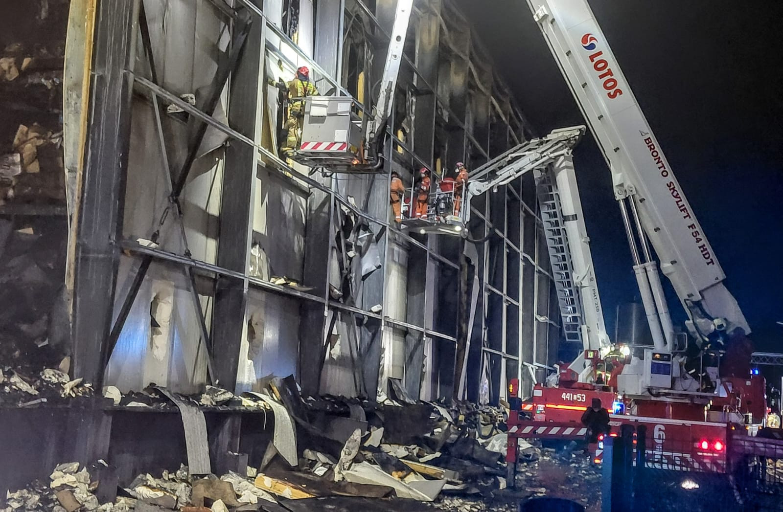 Na miejscu cały czas pracują służby. Łącznie to 40 zastępów PSP i OSP w których pracuje ponad 100 strażaków. Kontynuowana jest rozbiórka elementów konstrukcyjnych obiektu utrudniających prowadzenie rozpoznania, a także zagrażających ratownikom.