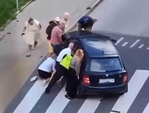 Na ratunek ruszyli przechodnie. Nagranie zdarzenia, które w błyskawicznym tempie obiegło internet, pokazuje grupę osób wspólnie unoszących pojazd, by uwolnić uwięzioną kobietę.