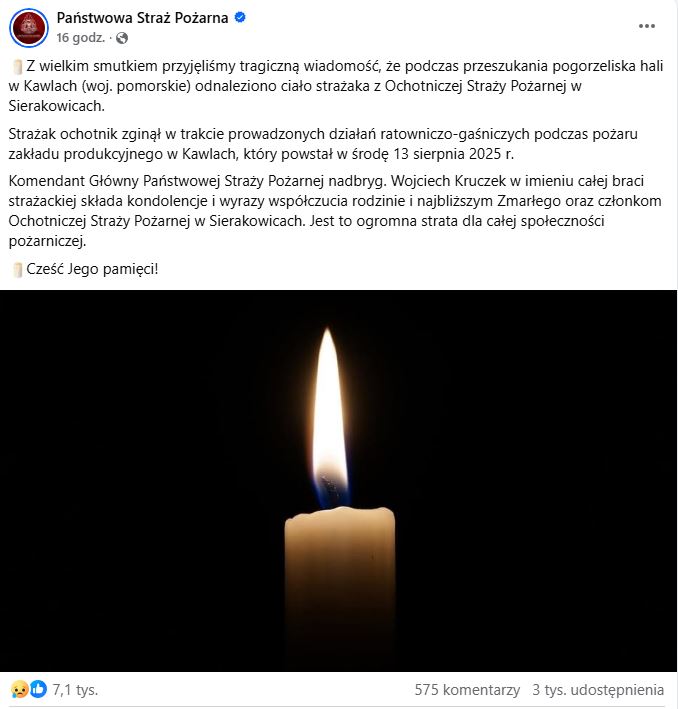 — Strażak ochotnik zginął w trakcie prowadzonych działań ratowniczo-gaśniczych. Cześć Jego pamięci! — napisał w oświadczeniu.