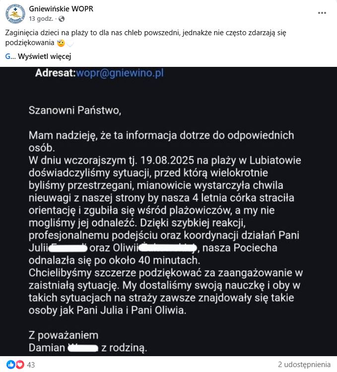 Podziękowania opublikowało w swoich mediach społecznościowych WOPR Gniewino. Ratownicy podkreślili, że takie sytuacje – choć bardzo częste – rzadko kończą się otrzymaniem tak serdecznych słów wdzięczności.