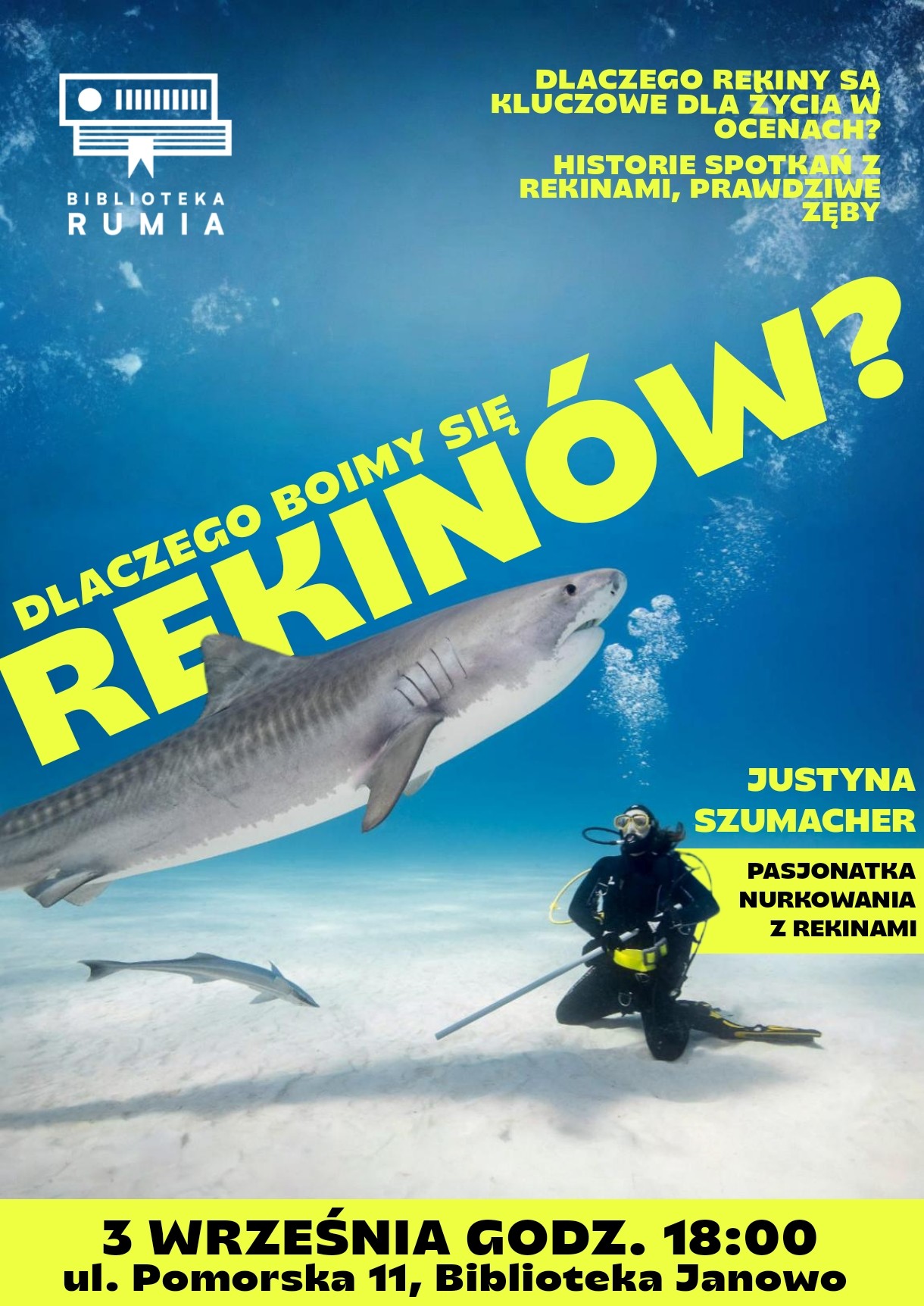 Dlaczego rekiny wciąż budzą w nas lęk? Czy naprawdę są groźne, czy to człowiek stanowi dla nich większe zagrożenie? I co by się stało z oceanami, gdyby zabrakło w nich rekinów? Na te pytania odpowie Justyna Szumacher – podróżniczka, edukatorka i pasjonatka nurkowania z rekinami, która od ponad 26 lat odkrywa tajemnice oceanów. Spotkanie odbędzie się w bibliotece w Rumi.