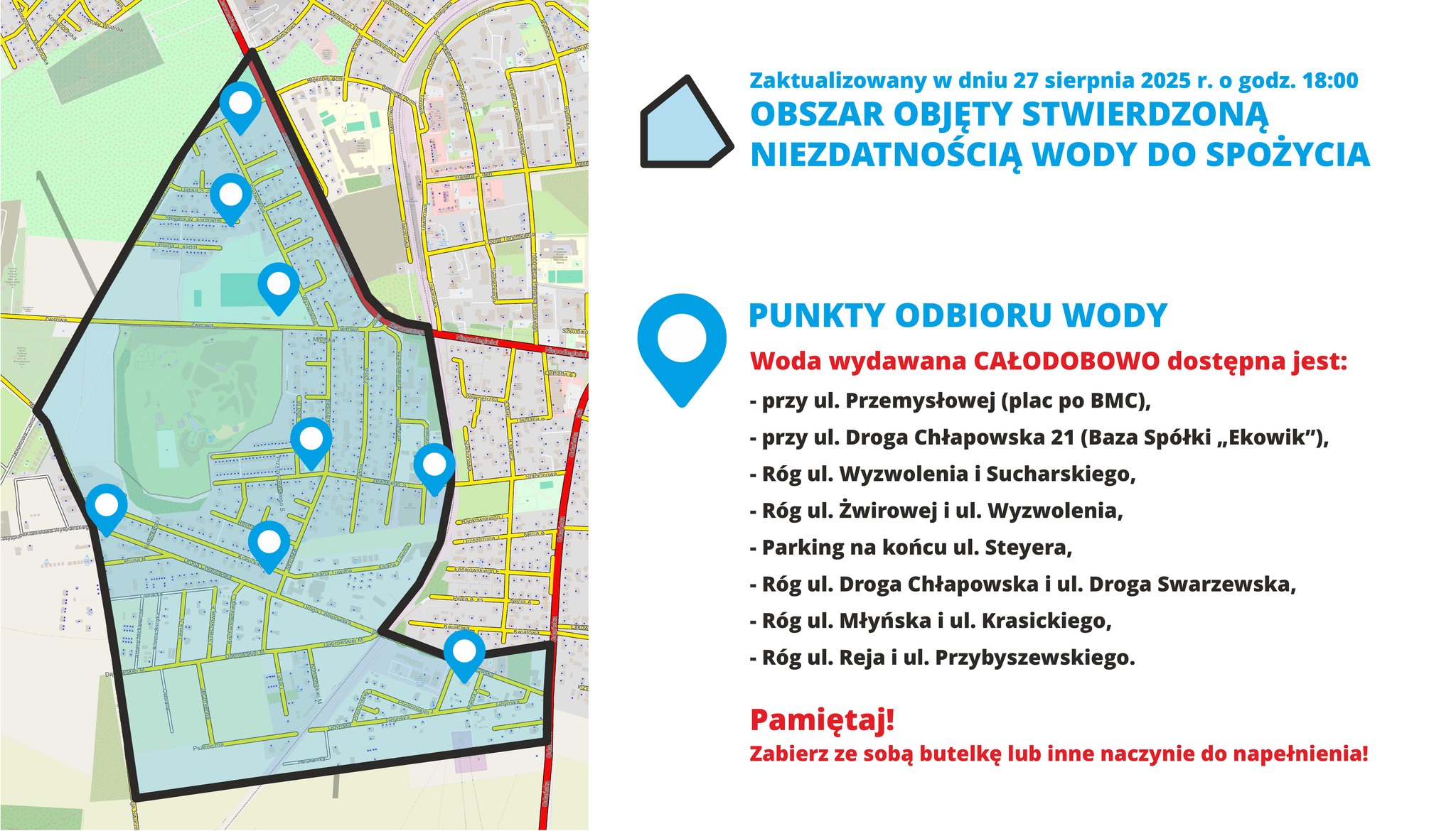 Woda z kranów w tej strefie: nie nadaje się do picia, przygotowywania posiłków ani mycia owoców i warzyw. Nie powinna być używana do kąpieli i przygotowywania napojów dla dzieci. Może być stosowana jedynie do spłukiwania toalet i prac porządkowych.