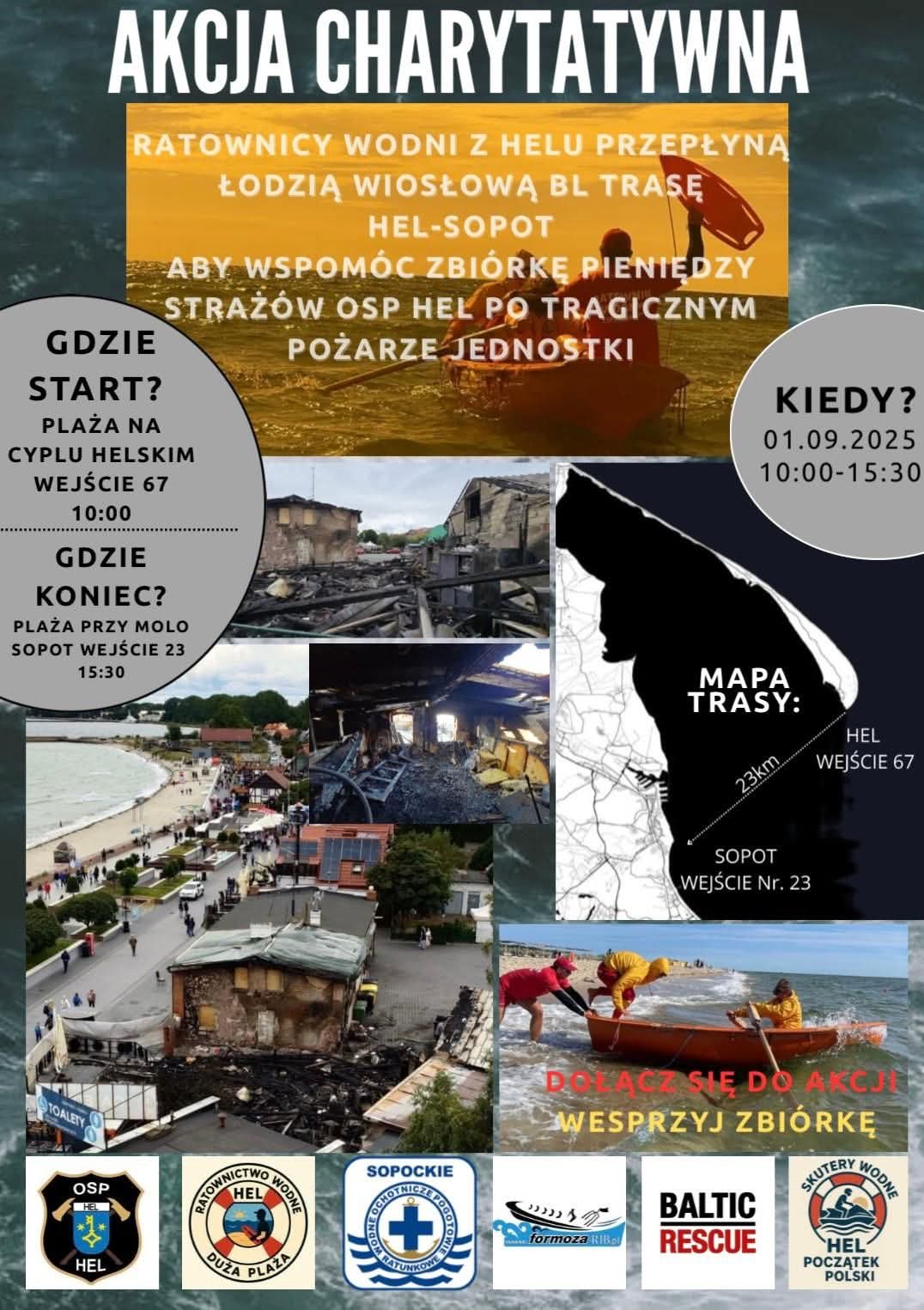 Cała społeczność lokalna solidaryzuje się ze strażakami Ochotniczej Straży Pożarnej w Helu. W wyniku dramatycznego pożaru spłonęła ich remiza strażacka. Trwa zbiórka na jej odbudowę. W pomoc w zebraniu niezbędnych środków zaangażowali się również ratownicy wodni z Helu, którzy postanowili przepłynąć łodzią wiosłową z Helu do Sopotu. Trasa liczy 23 kilometry.