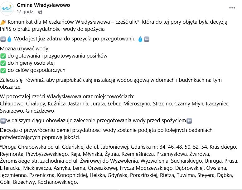 ???? Komunikat dla Mieszkańców Władysławowa – część ulic*, która do tej pory objęta była decyzją PiPIS o braku przydatności...