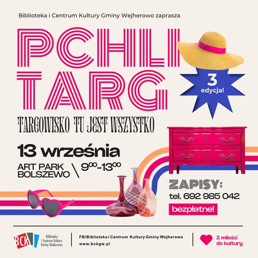 Biblioteka i Centrum Kultury Gminy Wejherowo zaprasza na trzecią edycję wyjątkowego wydarzenia, przyciągającego tłumy miłośników poszukiwania unikatów. Przed nami Pchli Targ „Tu jest wszystko”.