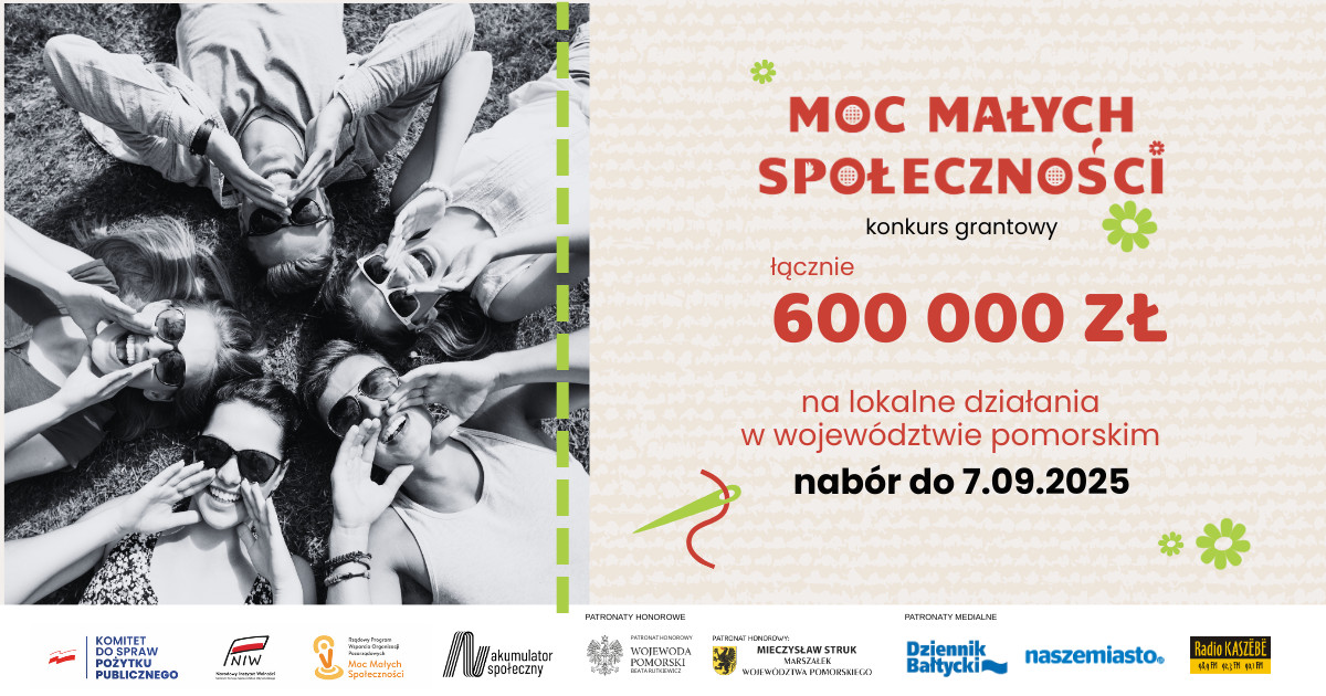 Do 7 września trwa nabór wniosków o granty dla małych i średnich organizacji pozarządowych oraz trzyosobowych grup mieszkańców z 18 powiatów województwa pomorskiego. Można ubiegać się o dofinansowanie w wysokości od 5 000 do 10 000 zł na realizację lokalnych inicjatyw. W ramach naboru przewidziano spotkania informacyjne, konsultacje oraz pomoc przy pisaniu wniosków.