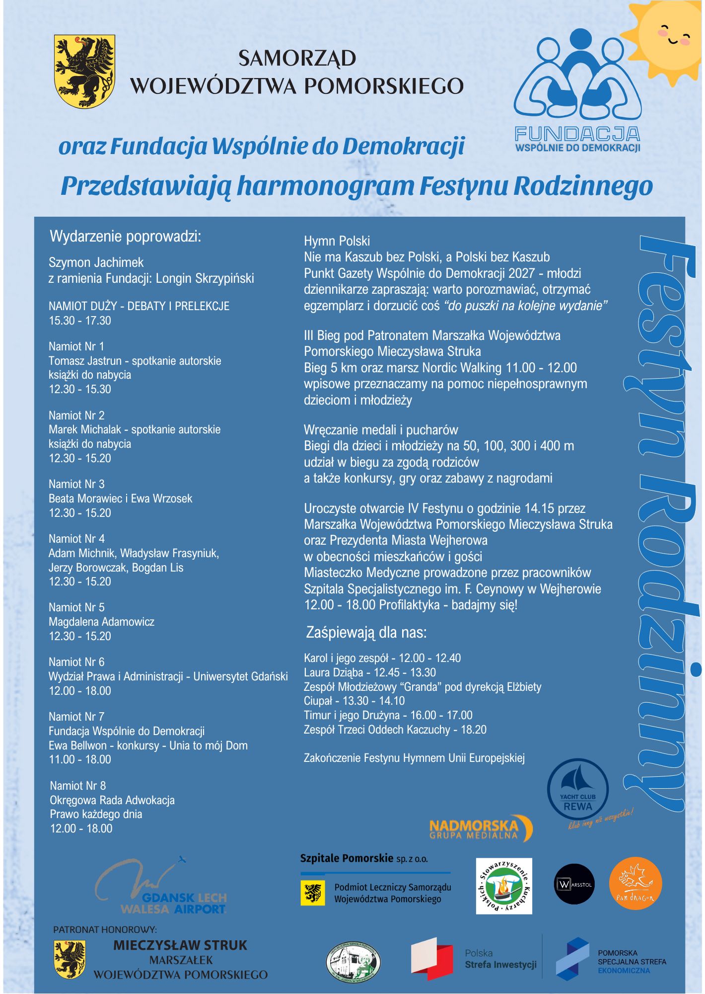 Całe rodziny spragnione atrakcji powinny tego dnia przybyć do parku miejskiego w Wejherowie. Będzie wiele atrakcji sportowych, zdrowotnych, ale także spotkania ze znanymi osobami. Teren parku zostanie podzielony na kilka stref tematycznych dotyczących m.in.: solidarności, praworządności, Unii Europejskiej i funduszy unijnych. W specjalnie przygotowanych namiotach odbędą się spotkania i debaty z wybitnymi pisarzami, dziennikarzami, politykami i specjalistami od Unii Europejski. Wśród nich warto wymienić: Tomasza Jastruna, Adama Michnika, ks. Wojciecha Lemańskiego, europosłankę Magdalenę Adamowicz, minister zdrowia Jolantę Sobierańską-Grendę, ministra sprawiedliwości i prokuratora generalnego Waldemara Żurka, prokurator Ewę Wrzosek, prof. dr hab. Annę Siewierską, Władysława Frasyniuka, Bogdana Lisa i Jerzego Borowczaka.