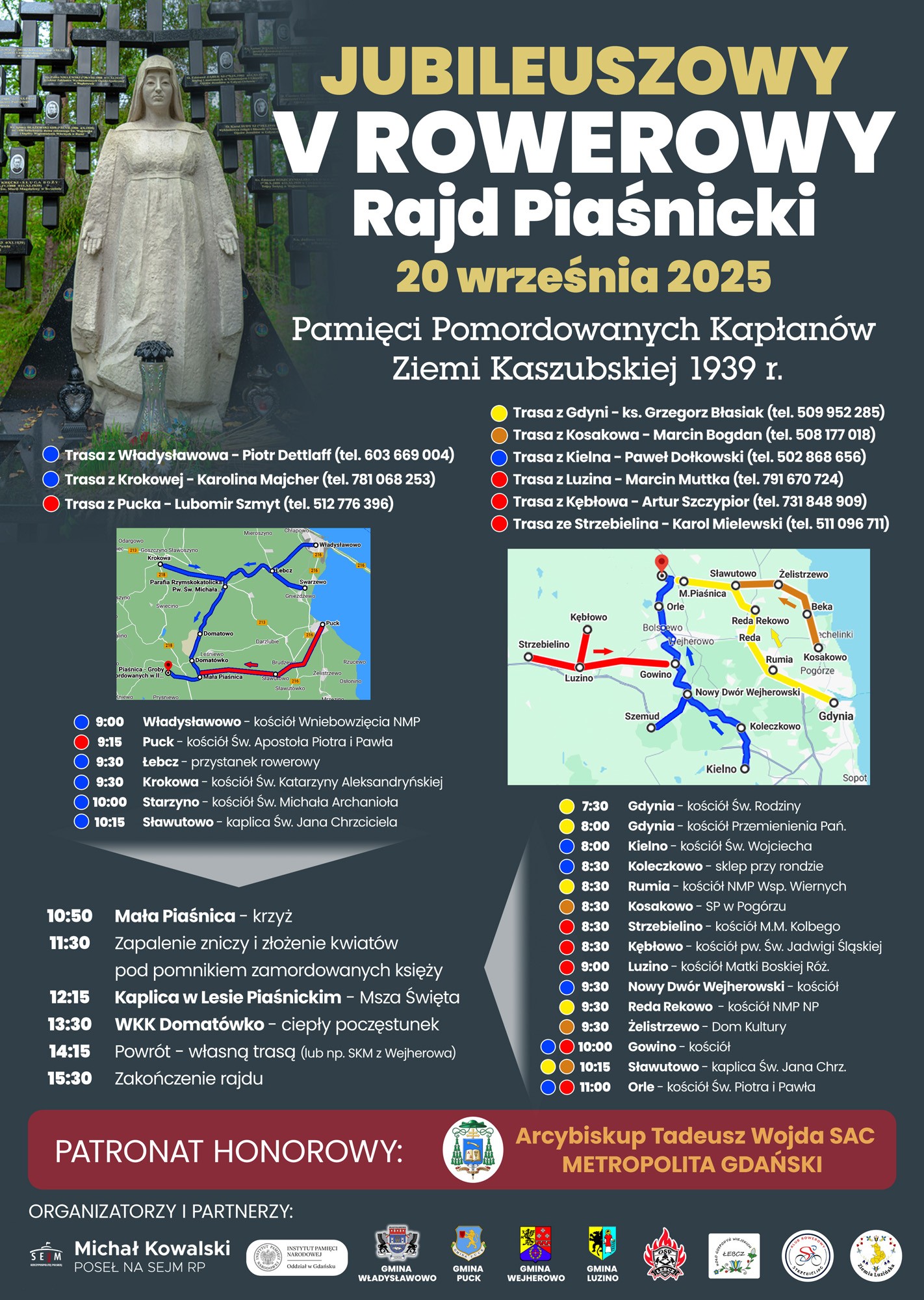 — V Rowerowy Rajd Piaśnicki 2025 śladami pomordowanych kapłanów Ziemi Kaszubskiej w 1939 - 1940 r. ma zintegrować środowiska katolickie i patriotyczne, ale przede wszystkim przypomnieć mieszkańcom Kaszub i Pomorza, iż masowe egzekucje ludności, w tym duchownych w Piaśnicy rozpoczęły się pod koniec października 1939 i były kontynuowane do początków kwietnia 1940 - mówi Michał Kowalski, poseł na Sejm, jeden z organizatorów przedsięwzięcia. - Stanowiły element tzw. akcji „Inteligencja”, a ich wykonawcami byli funkcjonariusze SS. Historycy oceniają, że ofiarą ludobójstwa dokonanego w lasach piaśnickich padło od 12 tys. do 14 tys. ludzi. W gronie ofiar znaleźli się liczni przedstawiciele polskiej inteligencji z Pomorza Gdańskiego, a także osoby duchowne, w tym kilkunastu księży posługujących na Ziemi Puckiej. Piaśnica stanowi największe, po KL Stutthof, miejsce kaźni ludności polskiej na Pomorzu w okresie II wojny światowej. Nazywana jest czasem „pomorskim Katyniem” lub „Kaszubską Golgotą”. Rowerowy Rajd Piaśnicki ma upamiętnić i oddać hołd pomordowanym księżom.