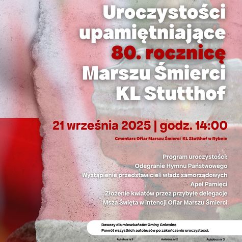 W niedzielę, 21 września, na Cmentarzu Ofiar Marszu Śmierci KL Stutthof w Rybnie odbędą się uroczystości upamiętniające 80. rocznicę tragicznych wydarzeń, które zapisały się krwawymi zgłoskami w historii Pomorza i całej Polski.