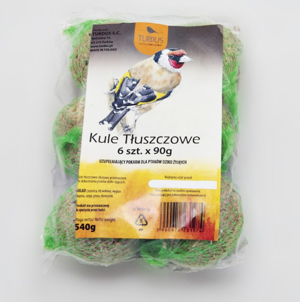 Kule tłuszczowe (np. kule o wadze 86 g oraz większe kule 500 g), które zawierają łój wołowy, rozdrobnioną pszenicę, słonecznik i owies czarny. Dzięki nim ptaki otrzymują potrzebne tłuszcze i kalorie, które są niezbędne do przetrwania mroźnych nocy.