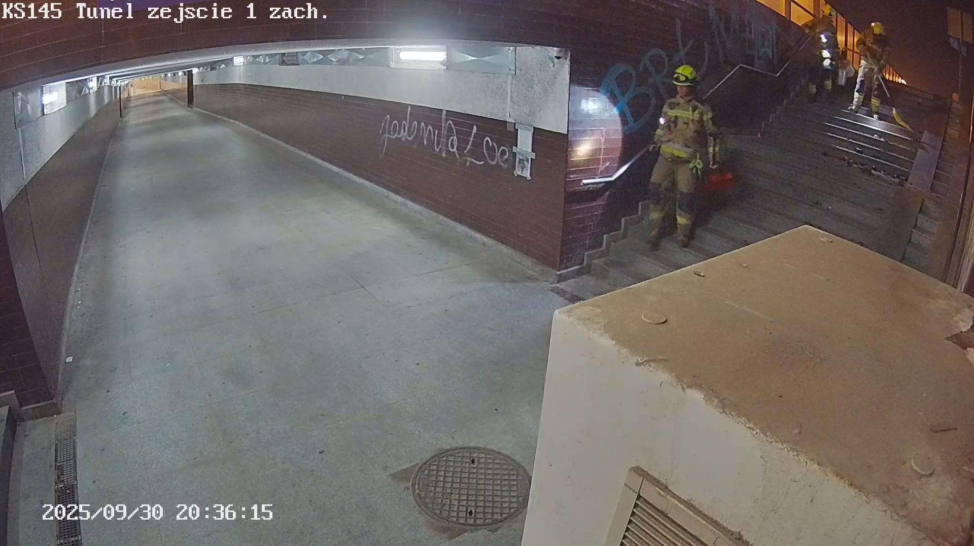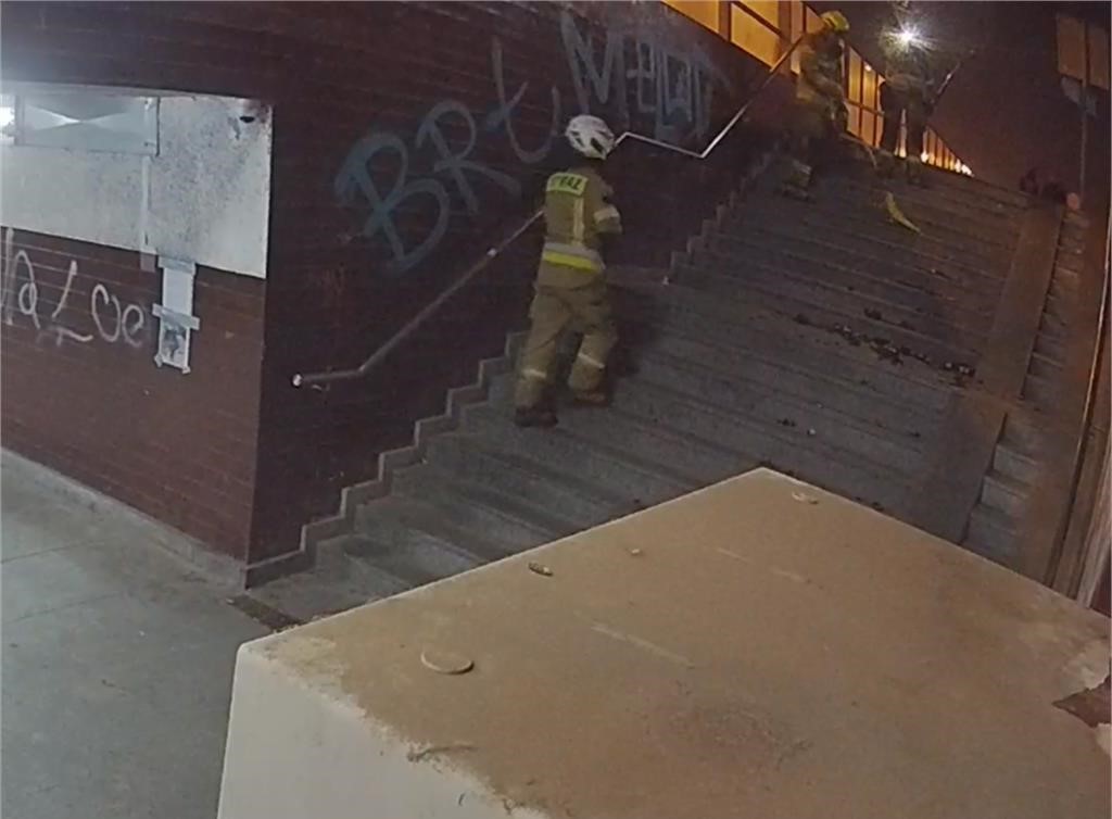 Jednocześnie strażnicy miejscy rozpoczęli czynności wyjaśniające. Analiza miejskiego monitoringu pozwoliła dokładnie odtworzyć przebieg zdarzenia. Okazało się, że już około godziny 13:30 do tunelu wszedł mężczyzna zajmujący się zbieraniem butelek po piwie i aluminiowych puszek. Najpierw wyniósł na chodnik torbę, a następnie wrócił po wózek wypełniony kolejnymi opakowaniami. Wózek jednak stoczył się ze schodów, a część butelek potłukła się.