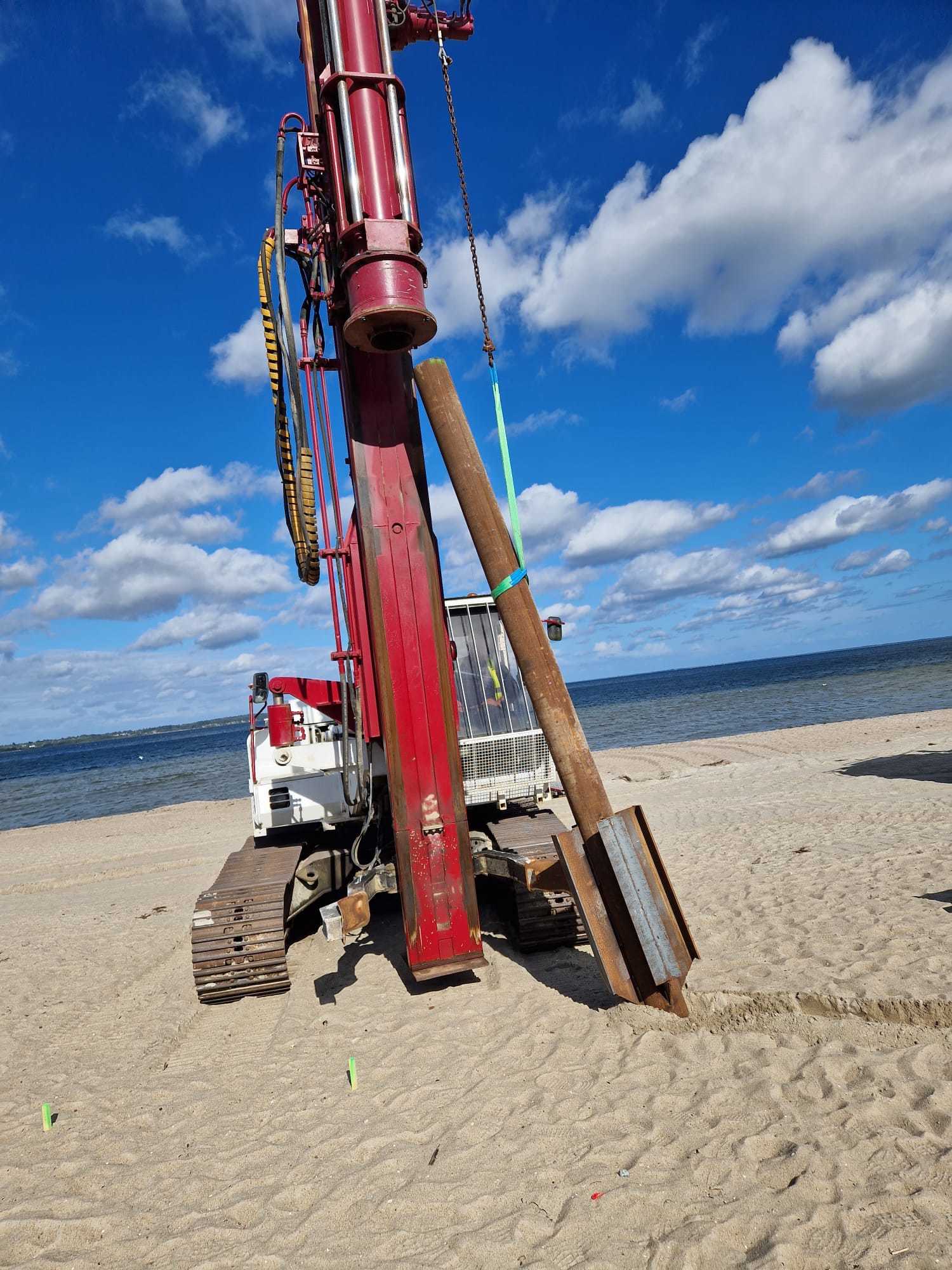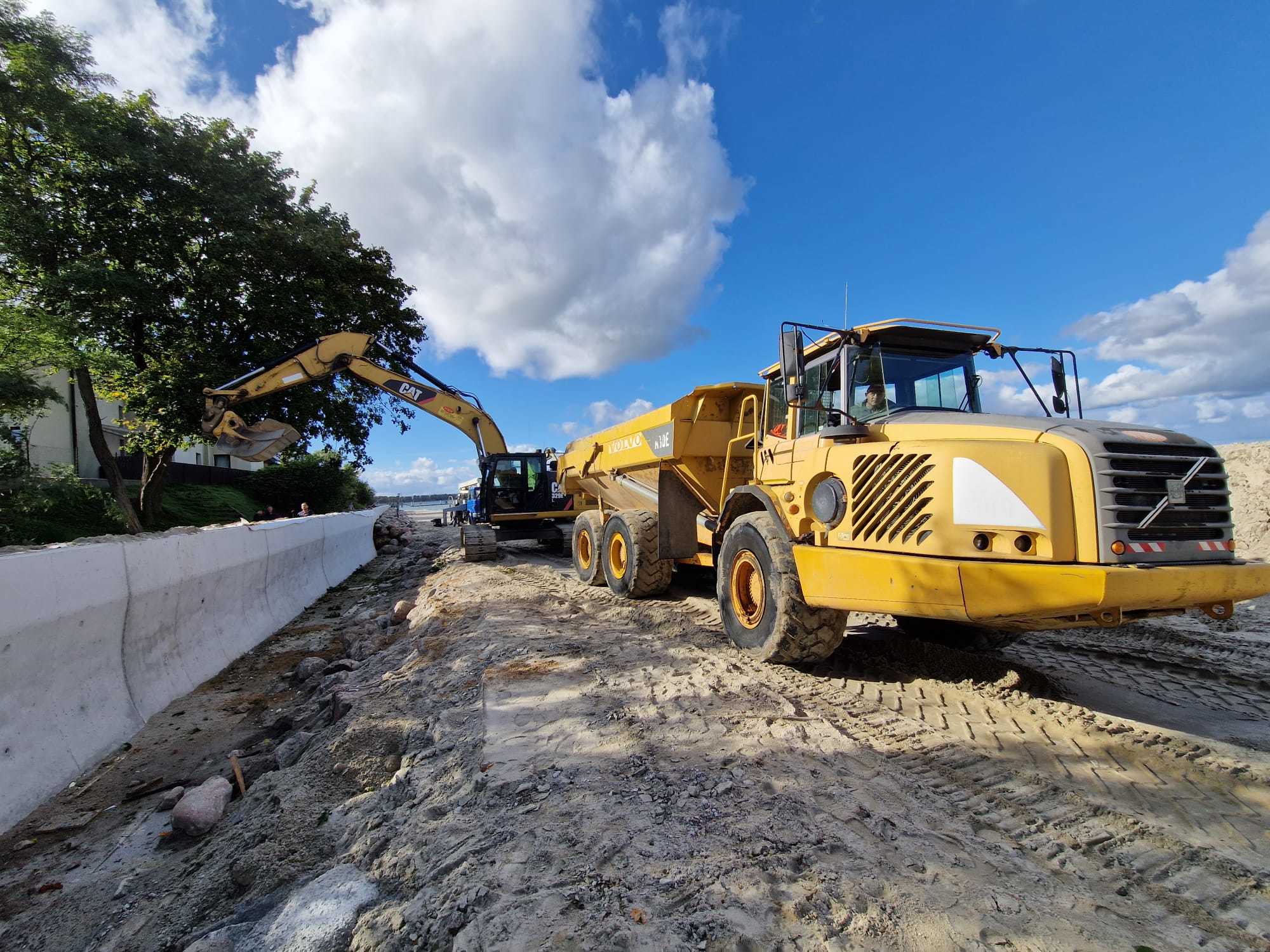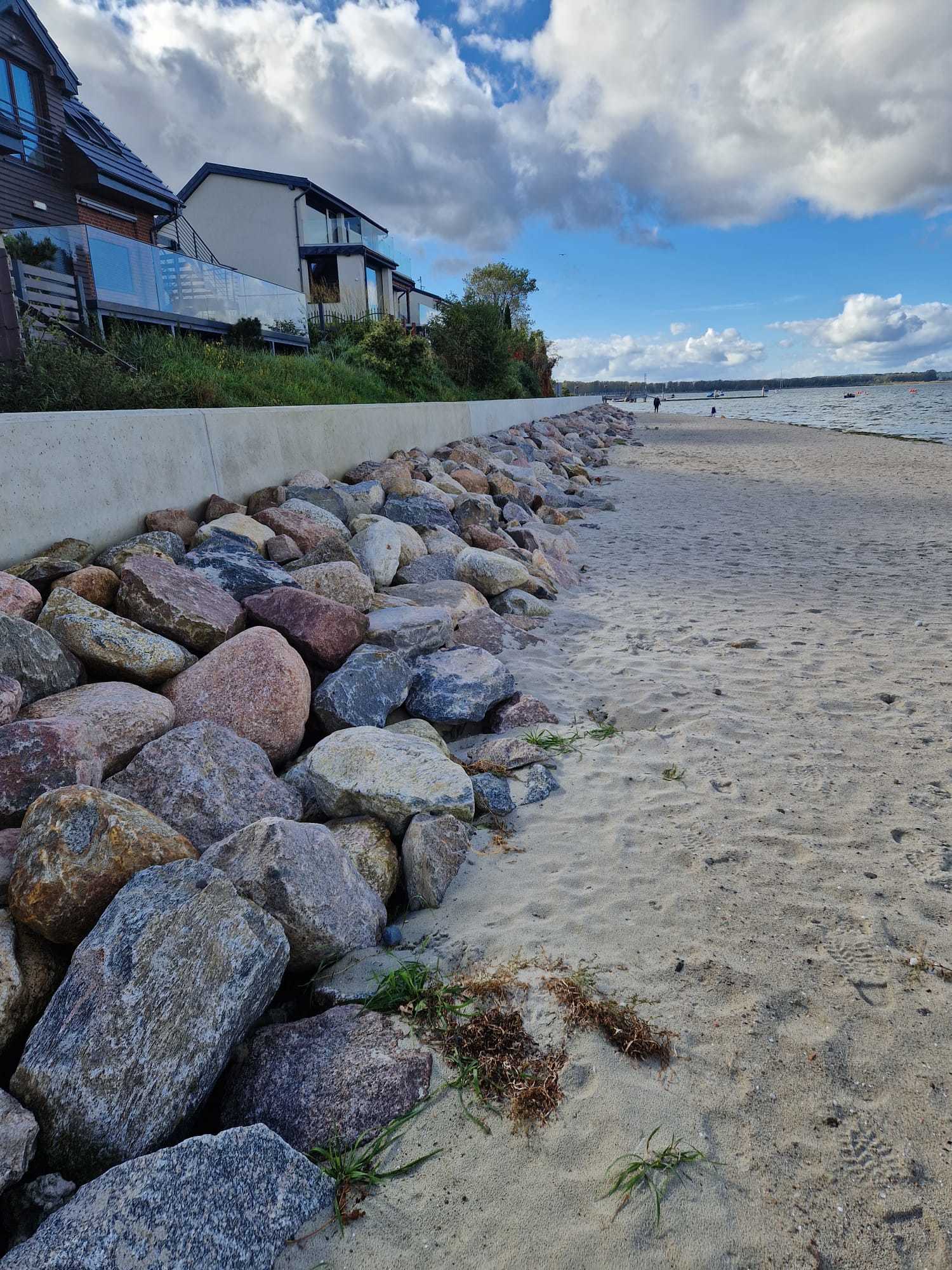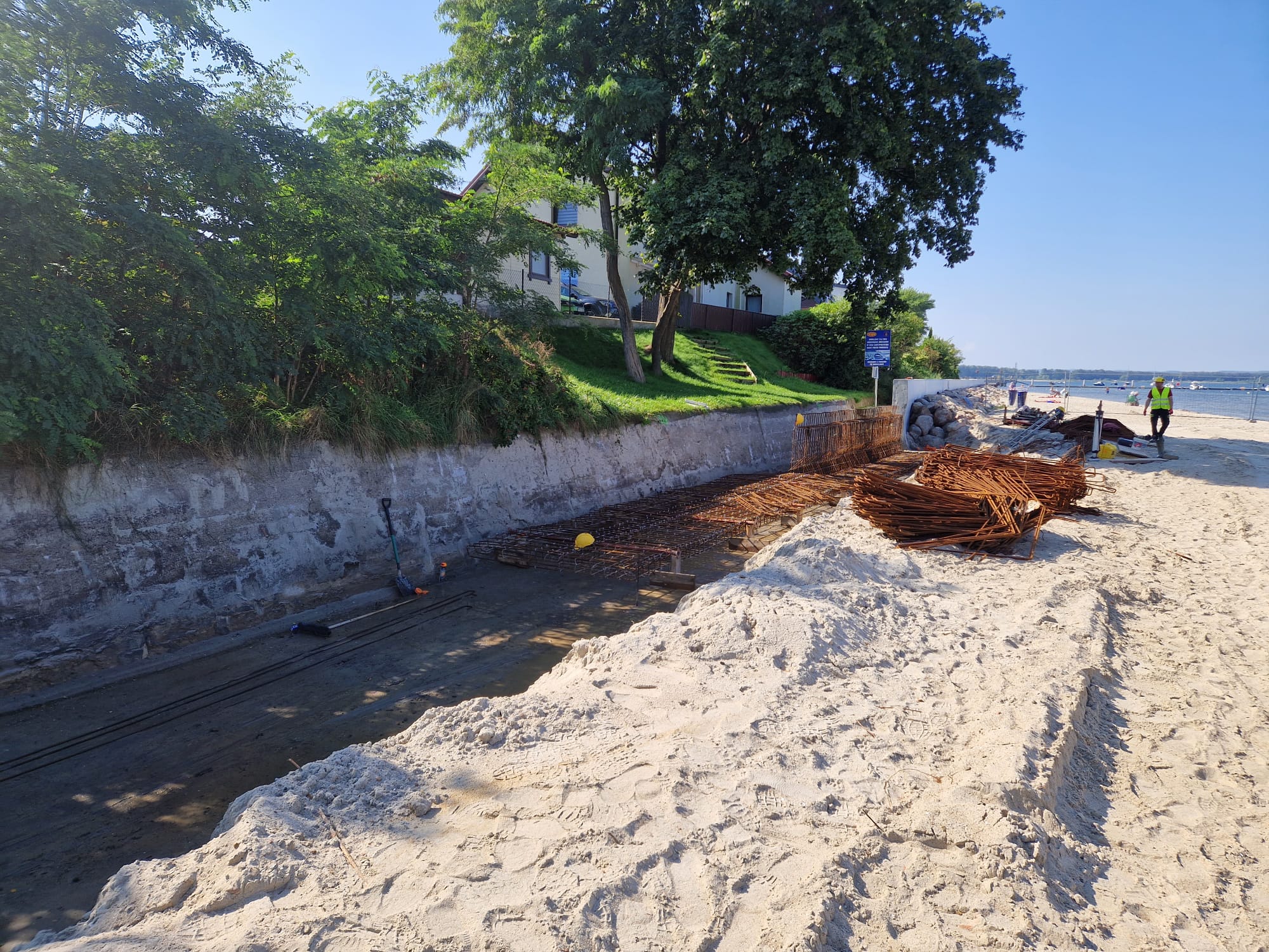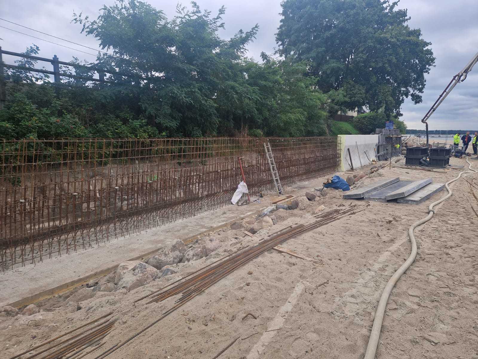 We wrześniu wykonano już około 50 metrów bieżących muru oporowego, obejmującego montaż materaców wypełnionych kruszywem oraz częściowy narzut kamienny. W tym czasie pogrążono również wszystkie pale rurowe, które stanowią fundament pod przyszłe zjazdy i zejścia na plażę.