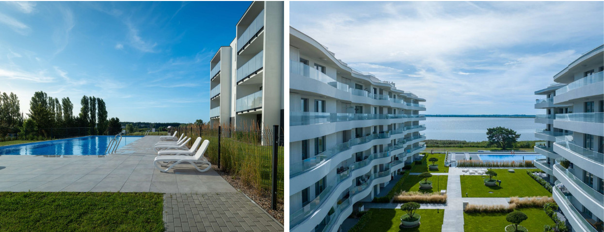 Apartamenty są oferowane z możliwością wykończenia „pod klucz”, przy użyciu materiałów marek klasy premium (m.in. Villeroy & Boch, Grohe czy Porcelanosa). Architektura jest współczesna, ale stonowana – jasne elewacje, duże przeszklenia i naturalne detale sprawiają, że budynki harmonijnie wpisują się w krajobraz między morzem a jeziorem.