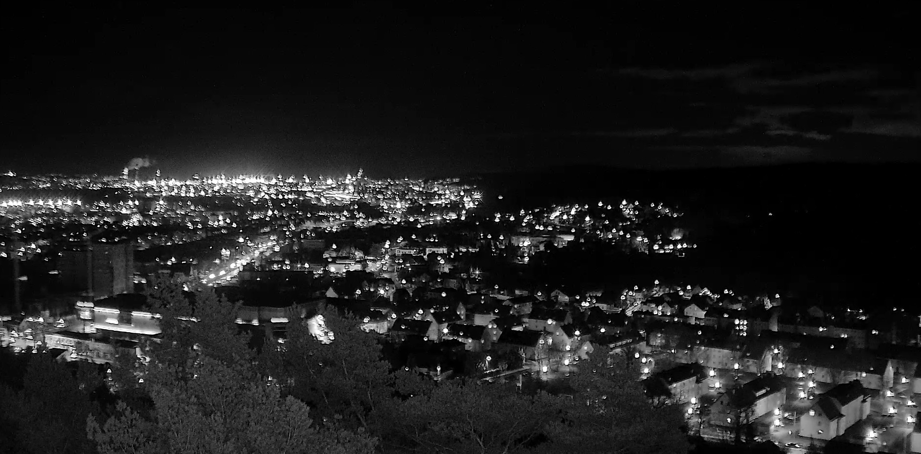 — Na zdjęciu widać nocną panoramę miasta w czerni i bieli, uchwyconą z wyżej położonego punktu (np. wzgórza lub tarasu widokowego). Na pierwszym planie są zarysy drzew oraz osiedle domów jednorodzinnych, oświetlonych latarniami ulicznymi i światłami z okien. W tle rozciąga się gęsto oświetlone centrum miasta. Po prawej stronie obraz stopniowo przechodzi w ciemniejszą, niemal czarną przestrzeń – może to być las, park lub otwarta przestrzeń - czytamy w opisie.