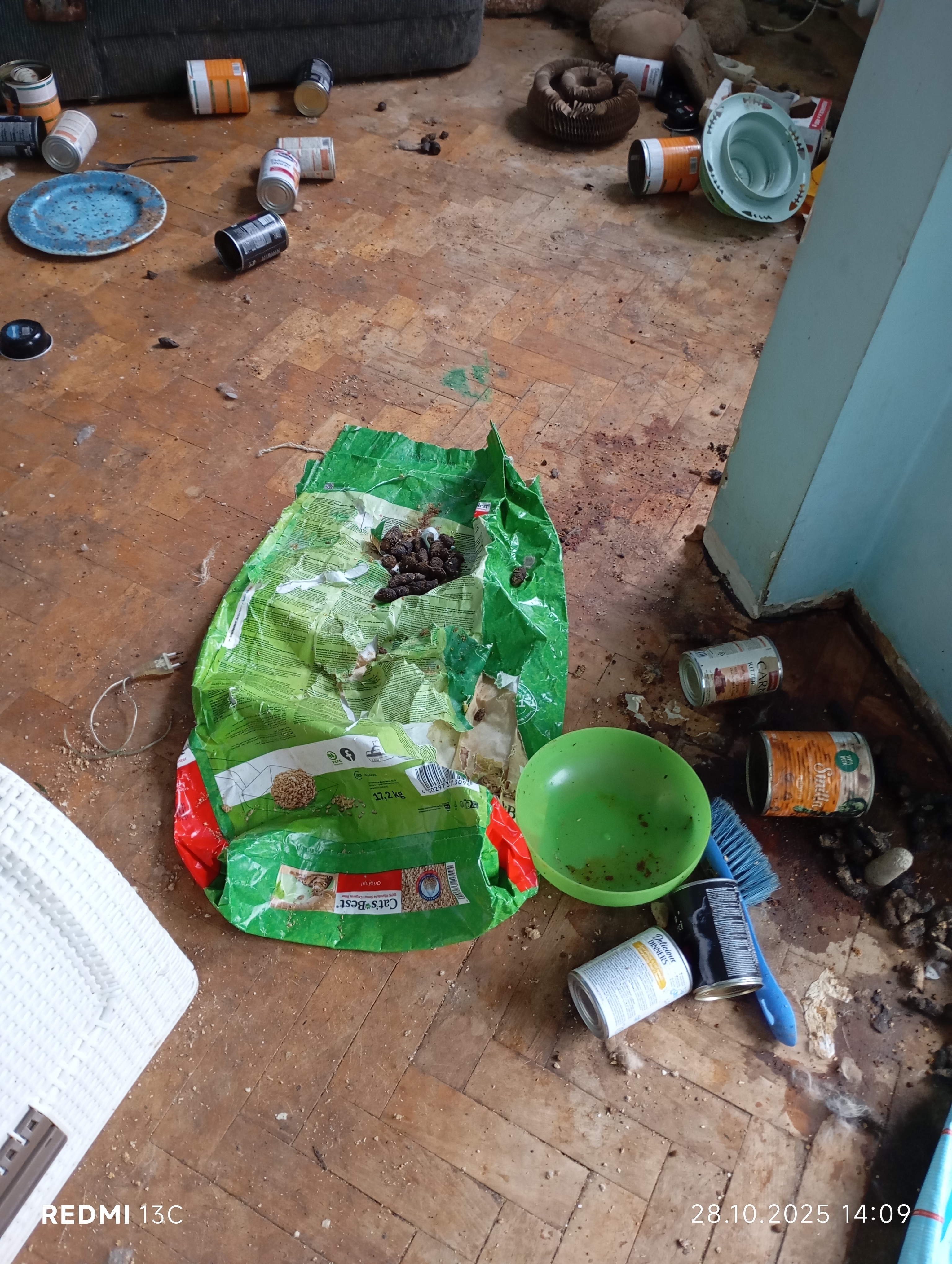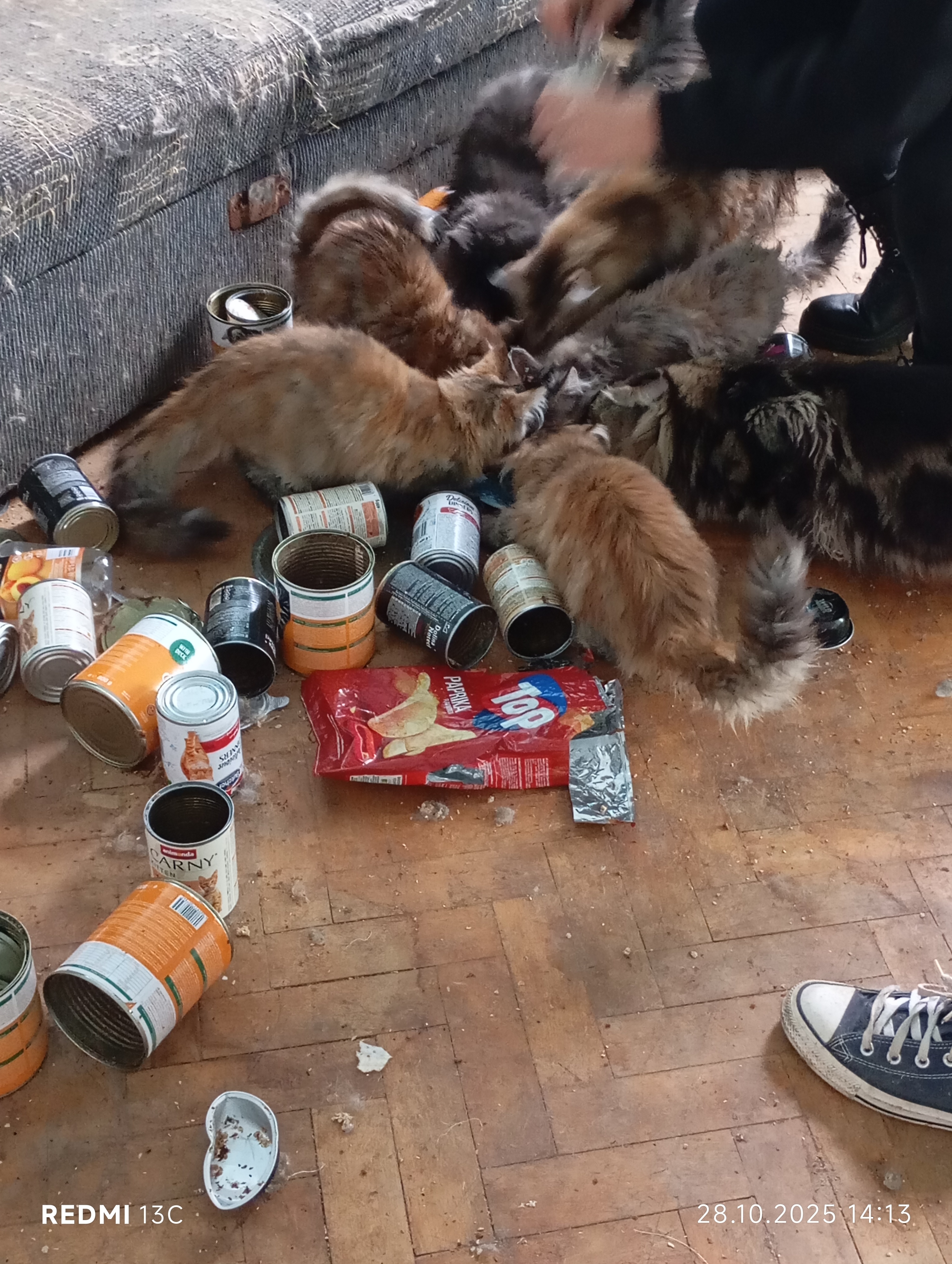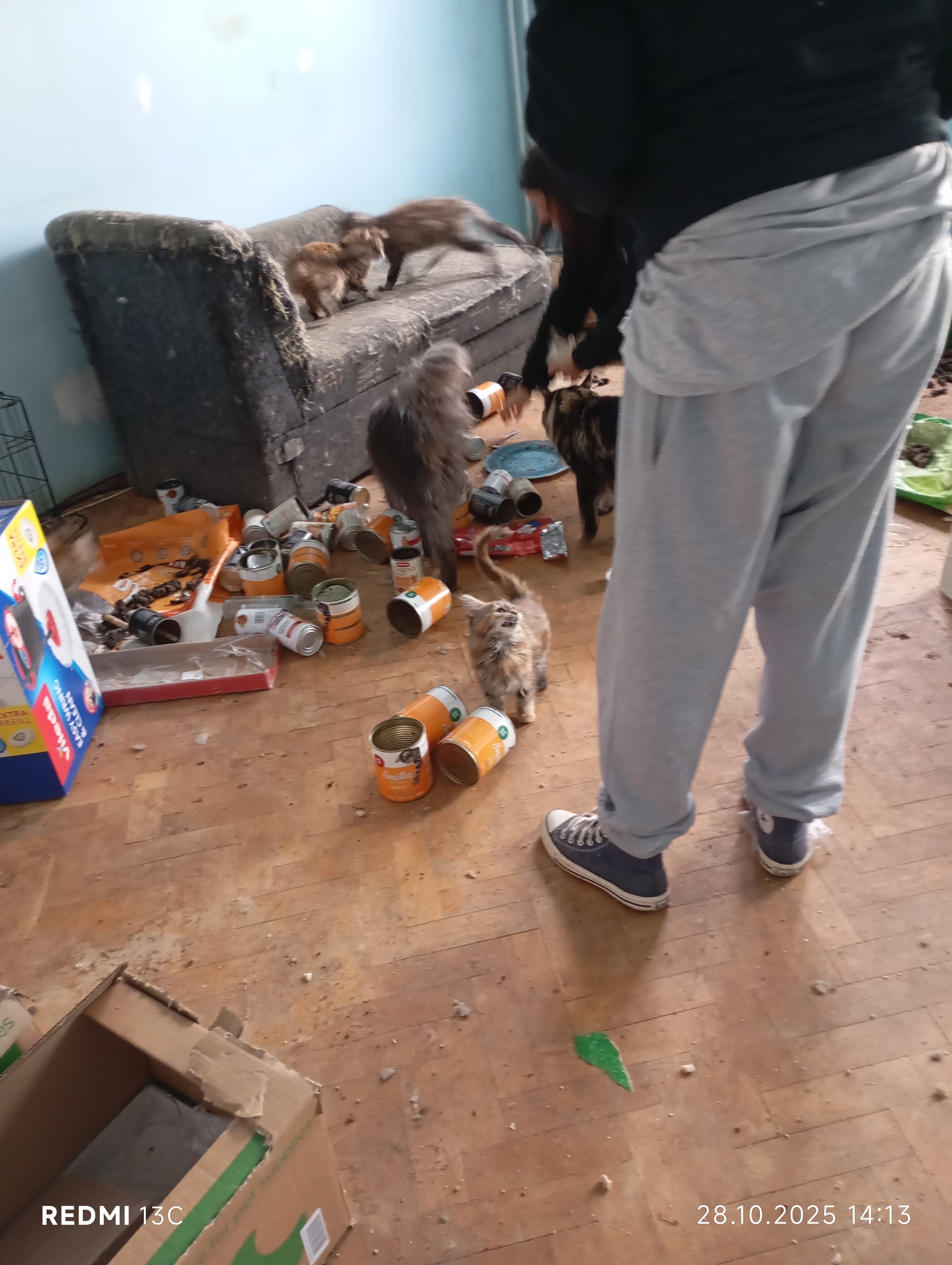 Inspektorzy OTOZ Animals przeprowadzili interwencję, podczas której zastali obraz dramatycznego zaniedbania. W mieszkaniu znajdowało się jedenaście kotów, przetrzymywanych w warunkach rażąco naruszających dobrostan zwierząt. Lokal był przepełniony śmieciami, zużytymi puszkami po karmie i warstwami odchodów. Brud był wszechobecny — również na meblach, które pokrywały kocie fekalia. W losowo porozstawianych miejscach stały przepełnione, od dawna nieczyszczone kuwety, a podłoga i nawet wanna służyły kotom za toaletę. W dniu interwencji zwierzęta nie miały dostępu do świeżej wody.