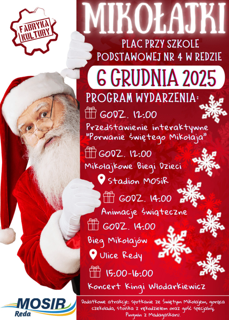 Fabryka Kultury wraz z Miejskim Ośrodkiem Sportu i Rekreacji przygotowały dla mieszkańców pełen atrakcji program mikołajkowy. Wstęp na wszystkie wydarzenia jest bezpłatny, a zabawa potrwa przez cały dzień – na placu przy Szkole Podstawowej nr 4, stadionie MOSiR oraz na ulicach miasta.