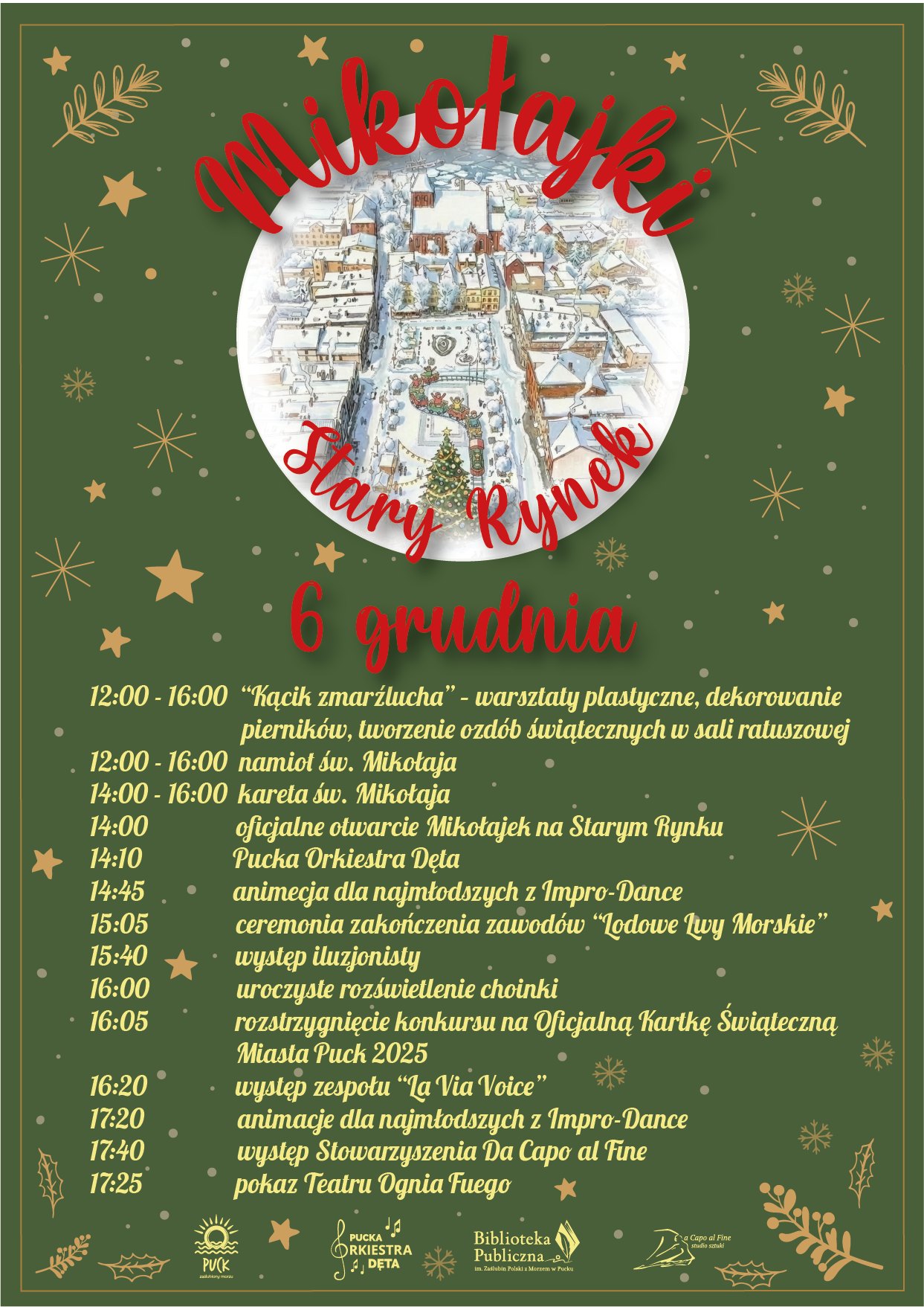 6 grudnia Stary Rynek w Pucku zamieni się w prawdziwą świąteczną krainę. Tego dnia na mieszkańców i gości czeka pełen atrakcji program mikołajkowy, obejmujący warsztaty, koncerty, animacje, pokazy i spotkania ze Świętym Mikołajem. Imprezę organizują m.in. Miasto Puck, Pucka Orkiestra Dęta oraz Biblioteka Publiczna w Pucku.