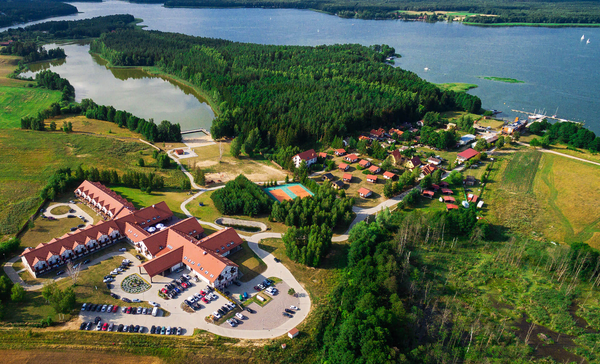 Na terenie obiektu znajdują się również boiska, trampolina, stoły do gier (ping-pong i piłkarzyki) oraz wypożyczalnia rowerów. Można skorzystać z rowerów wodnych, desek SUP czy kajaków – to świetny sposób na rodzinne aktywności i odkrywanie uroków Mazur z zupełnie nowej perspektywy.