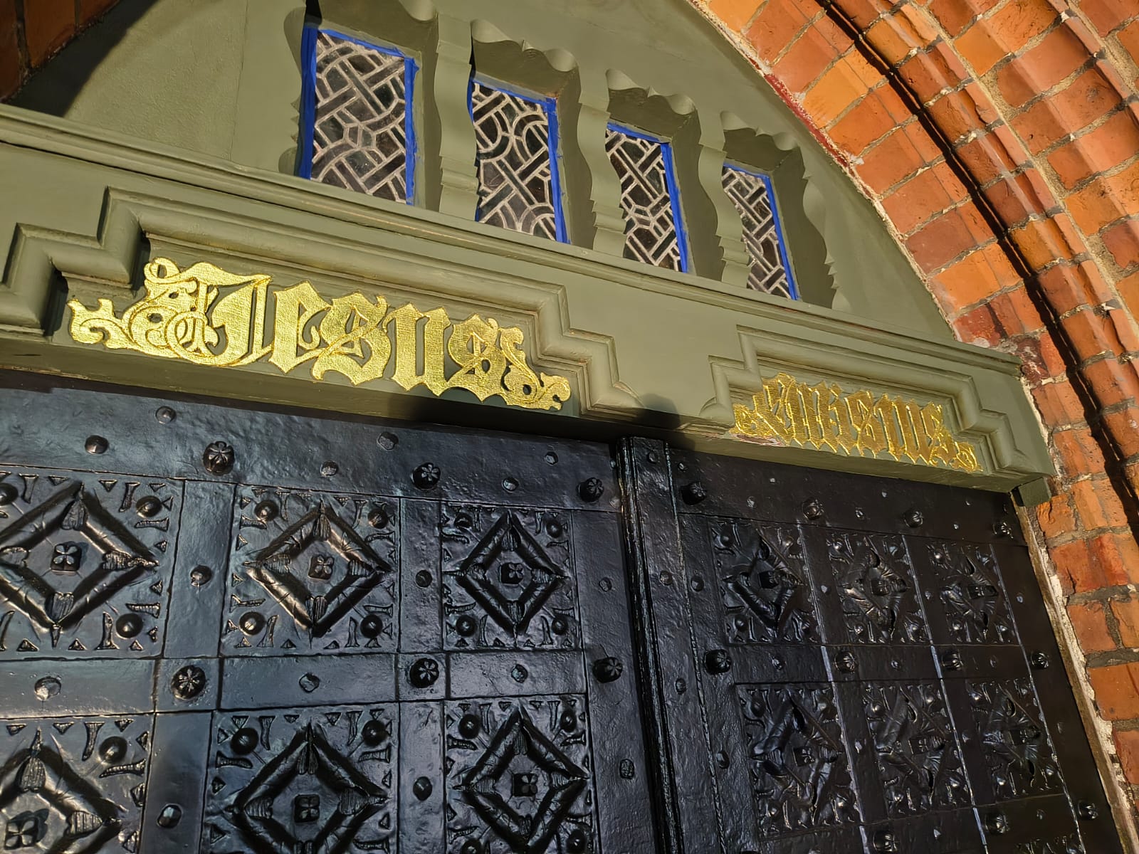 — Na zdjęciu widzę wejście do zabytkowego budynku, najprawdopodobniej kościoła. W centralnej części znajdują się masywne, ciemne, metalowe drzwi bogato zdobione tłoczeniami i nitami, utrzymane w stylistyce gotyckiej lub neogotyckiej. Nad drzwiami umieszczono dwie złote inskrypcje wykonane ozdobnym, gotyckim krojem pisma – po lewej stronie widoczne jest chrześcijańskie „IHS”, a po prawej druga, również sakralna inskrypcja. Powyżej znajdują się dwie niewielkie ozdobne okiennice z geometrycznymi kratami. Całość otacza charakterystyczny ceglany łuk, typowy dla historycznej architektury sakralnej. niech moc będzie z tobą - czytamy w opisie.