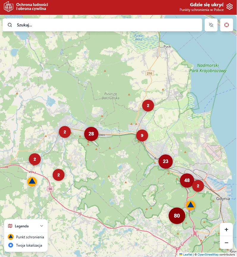 To aplikacja która pozwala na szybkie zlokalizowanie punktów ochrony ludności w całym kraju. Np. na terenie Wejherowa jest około 30 takich miejsc, a w sąsiedniej Redzie - 8.