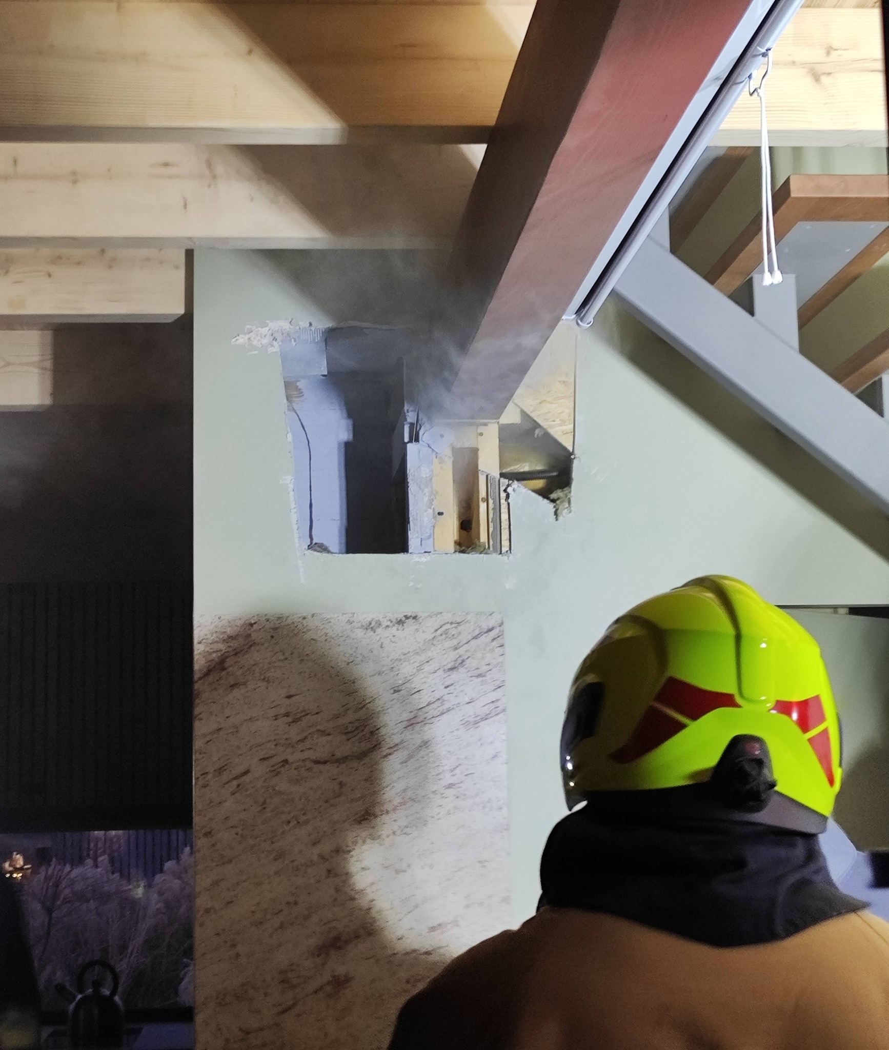 Na miejsce skierowano kilka zastępów straży pożarnej oraz patrol policji. Po przybyciu strażacy zabezpieczyli teren zdarzenia oraz zamknęli wszystkie okna i drzwi w budynku. Następnie rozpoczęto częściową rozbiórkę zabudowy kominka przy użyciu podręcznego sprzętu burzącego. W jej trakcie zlokalizowano zarzewie ognia.