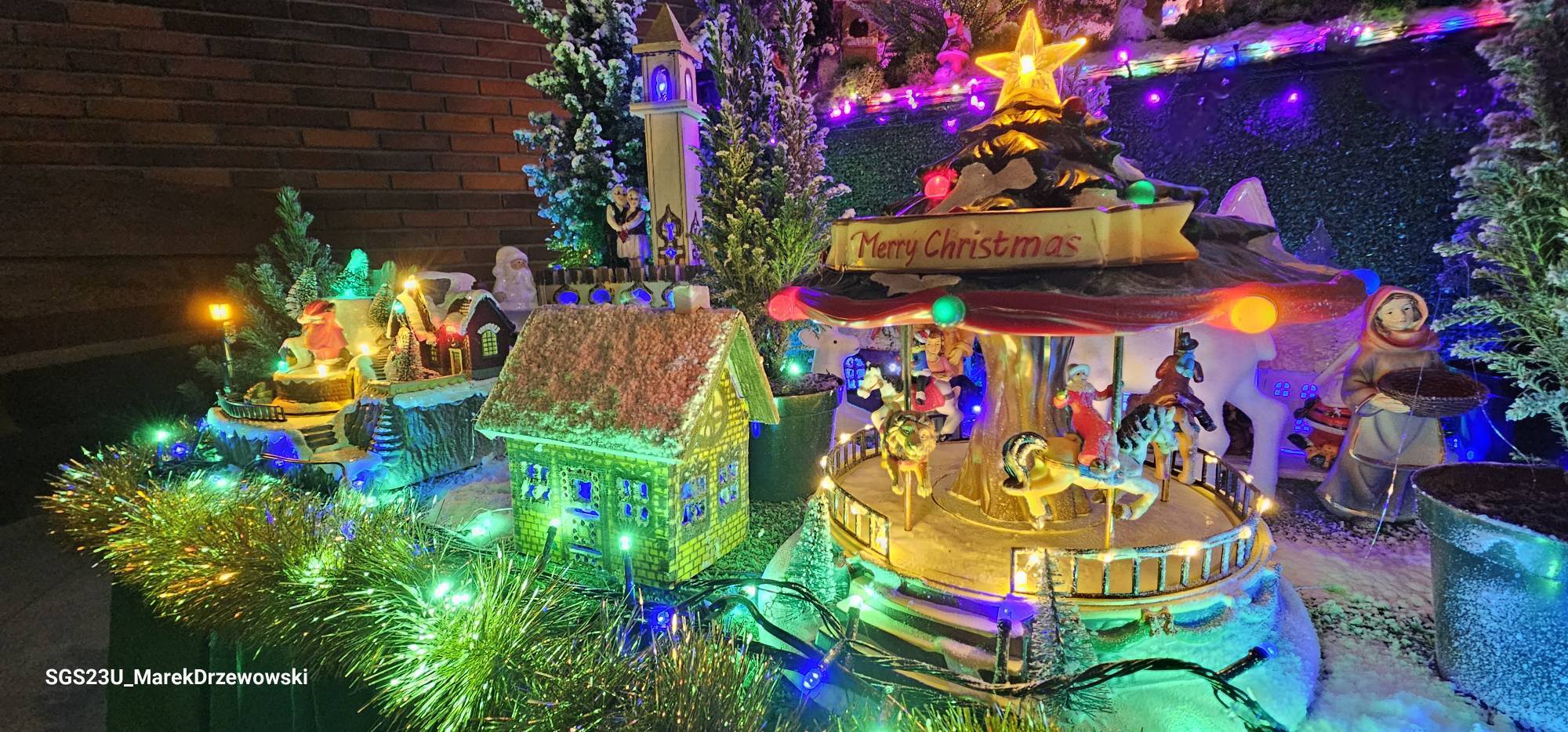 Szopka pana Ryszarda to rozbudowana, wieloelementowa instalacja, w której każdy fragment przyciąga uwagę. Znajdziemy tu kilka betlejemskich szopek, liczne kościoły i kościółki, w tym charakterystyczną miniaturę choczewskiej parafii. Są też elementy ruchome: grająca karuzela, stok narciarski, lodowisko, a nawet pociąg prowadzony przez świętego Mikołaja. Całość dopełnia niebo pełne migoczących gwiazd.