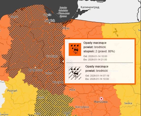 Ostrzeżenie przed marznącym deszczem i gołoledzią obowiązuje w środę, 14 stycznia, i w czwartek 15 stycznia 2026 r. Do mieszkańców Pomorza trafił w tej sprawie alert RCB.