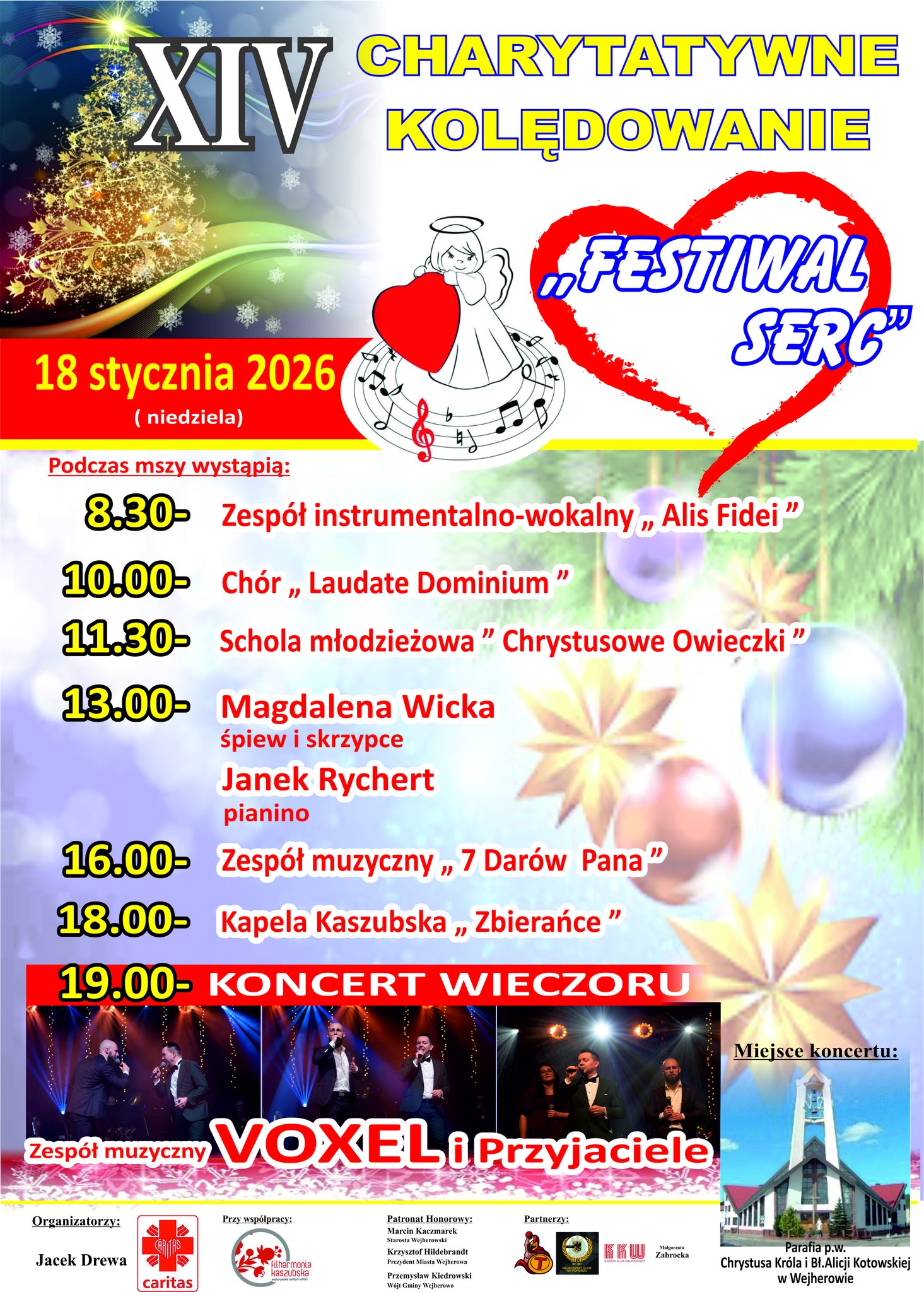 Kolejna edycja festiwalu tradycyjnie odbędzie się w Parafii pw. Chrystusa Króla i bł. Alicji Kotowskiej w Wejherowie i połączy duchowy wymiar modlitwy z bogatym programem artystycznym. W niedzielę, 18 stycznia podczas każdej mszy świętej wystąpią zaproszeni wykonawcy, prezentując kolędy i utwory o charakterze religijnym oraz świątecznym.