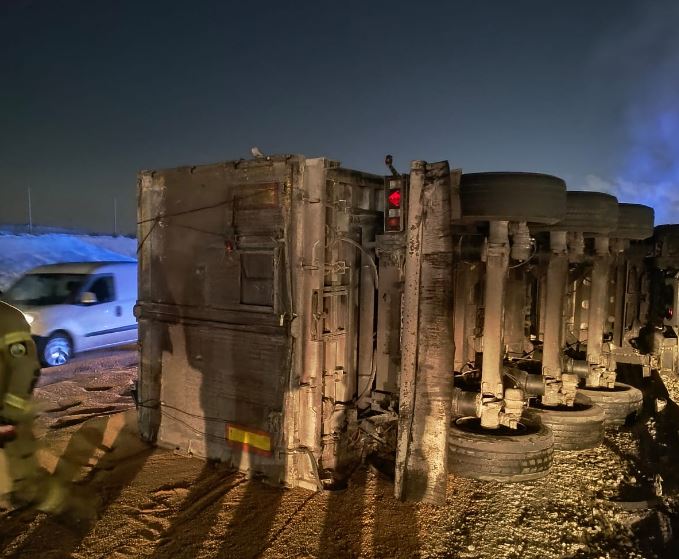 Ciężarówka uderzyła w bariery energochłonne, po czym przewróciła się na bok. W wyniku wypadku zboże znajdujące się w naczepie wysypało się na jezdnię. Na miejsce natychmiast skierowano służby ratunkowe.