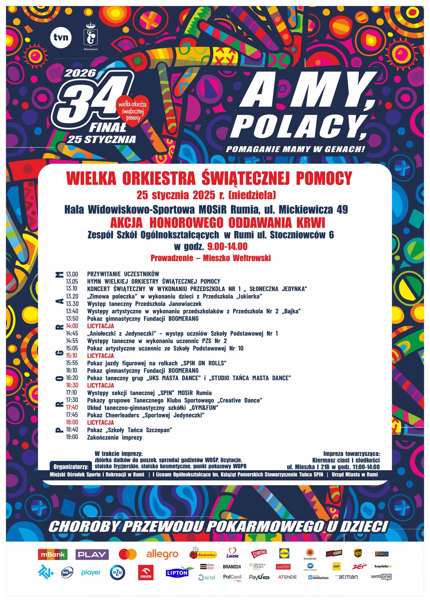 Część sceniczna w hali MOSiR rozpocznie się o godzinie 13:00. W programie znalazły się występy dzieci i młodzieży z rumskich przedszkoli i szkół, pokazy taneczne i gimnastyczne, prezentacje lokalnych grup artystycznych oraz liczne licytacje na rzecz WOŚP. Wśród wykonawców pojawią się m.in. zespoły taneczne, cheerleaderki, szkoły tańca oraz Fundacja Boomerang. Finał wydarzenia zaplanowano na godzinę 19:00.