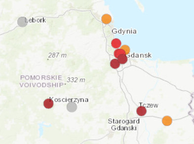 Na Pomorzu szczególnie niepokojąca sytuacja dotyczy miast aglomeracji trójmiejskiej oraz ich zaplecza. W Wejherowie, Rumii i Gdyni odnotowano stężenia pyłów zawieszonych znacznie przekraczające dopuszczalne normy. W wielu punktach pomiarowych jakość powietrza została określona jako zła lub bardzo zła, a lokalne indeksy jakości powietrza osiągały wartości uznawane za niebezpieczne.