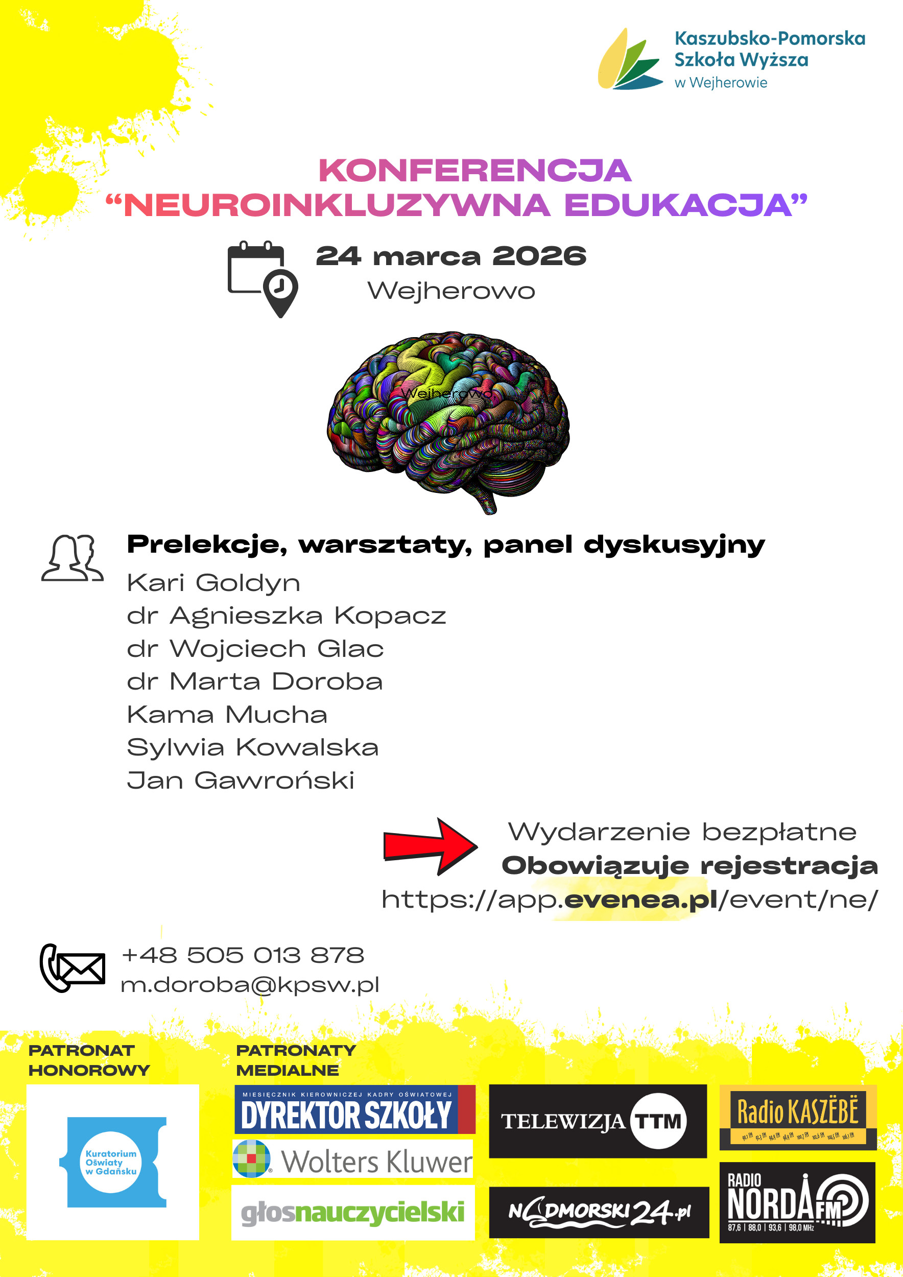 24 marca 2026 roku w Kaszubsko-Pomorskiej Szkole Wyższej w Wejherowie odbędzie się konferencja „Neuroinkluzywna Edukacja” – wydarzenie poświęcone neuroróżnorodności i neuroatypowości w projektowaniu systemów oświatowych oraz codziennej pracy edukacyjnej.