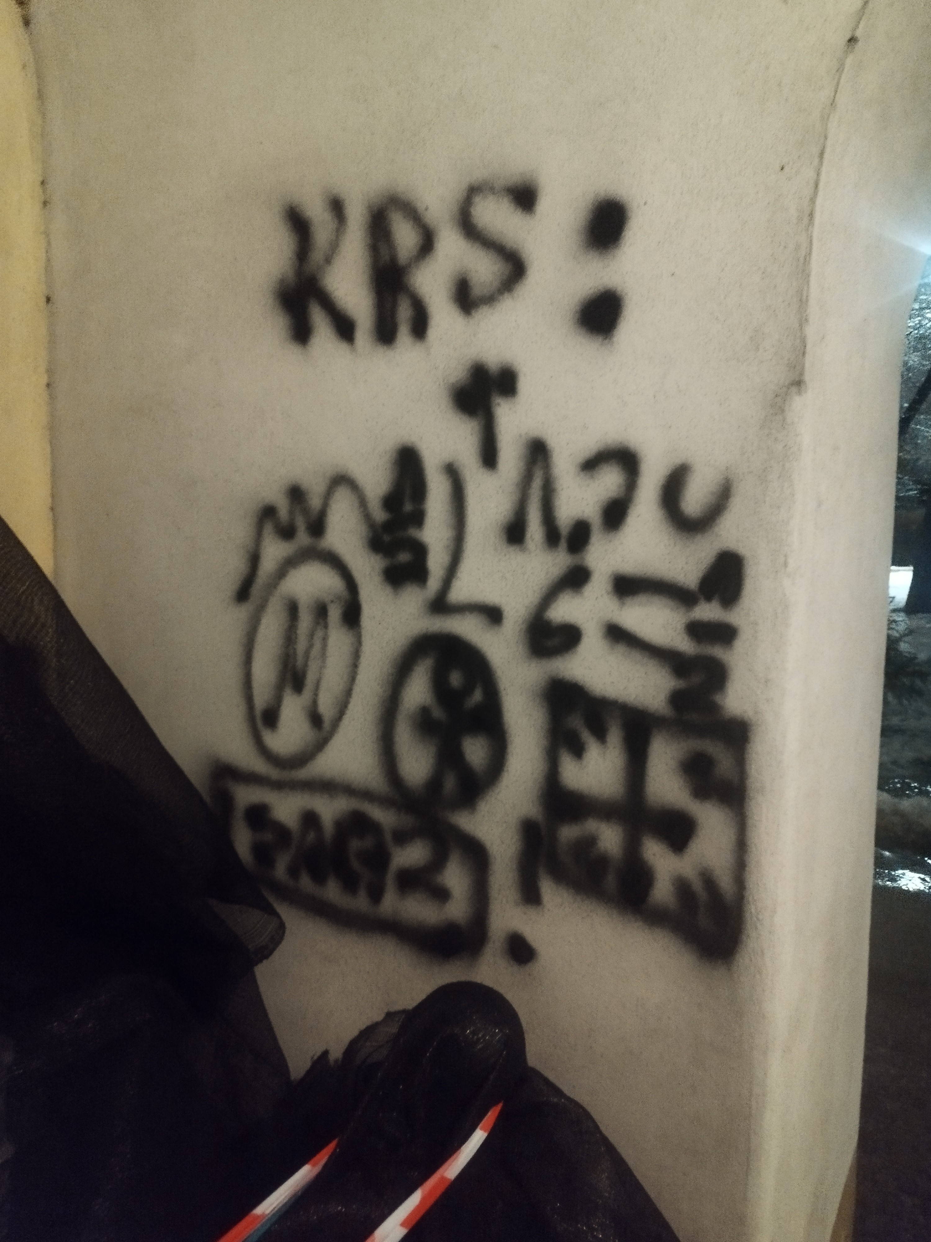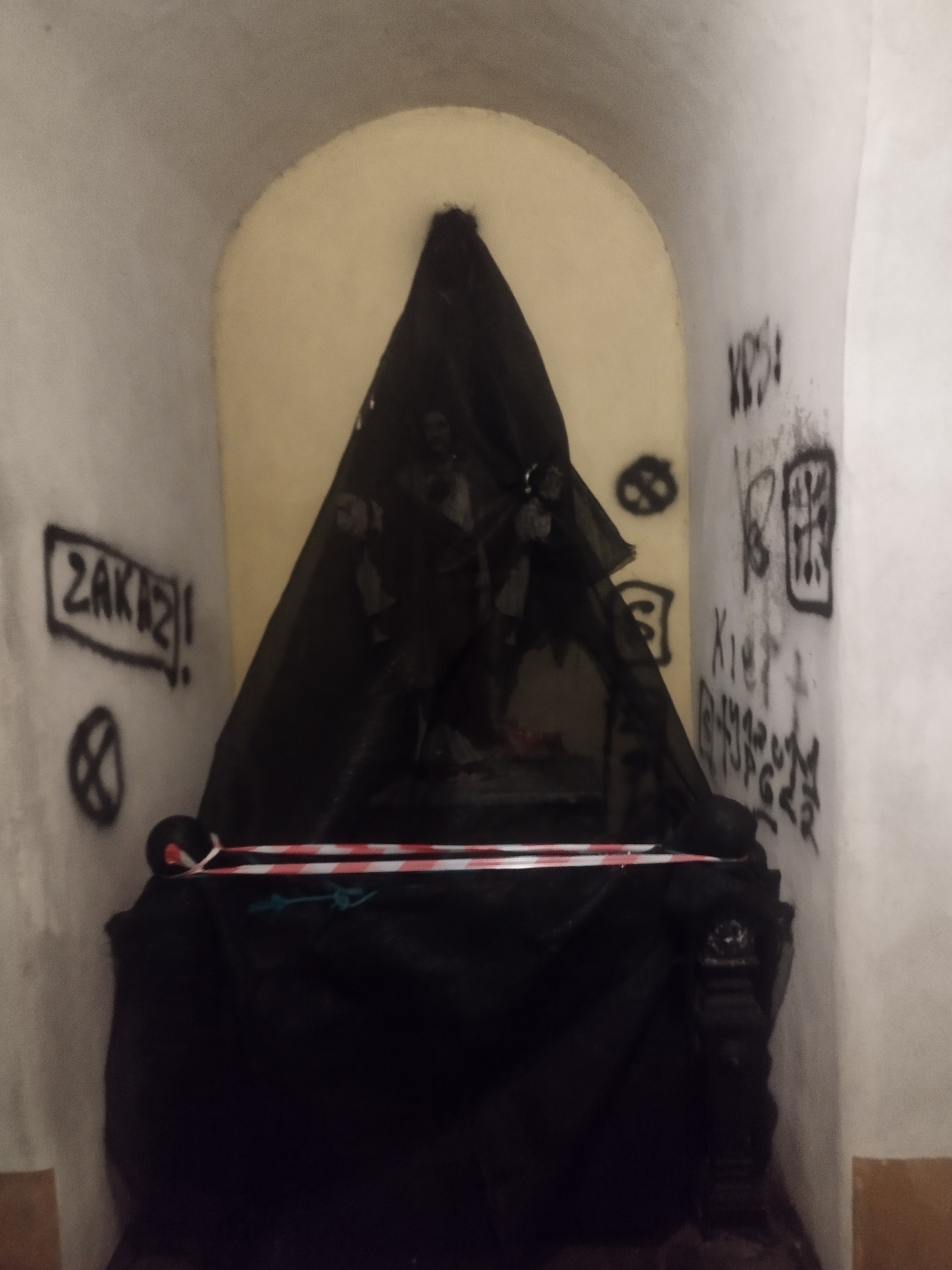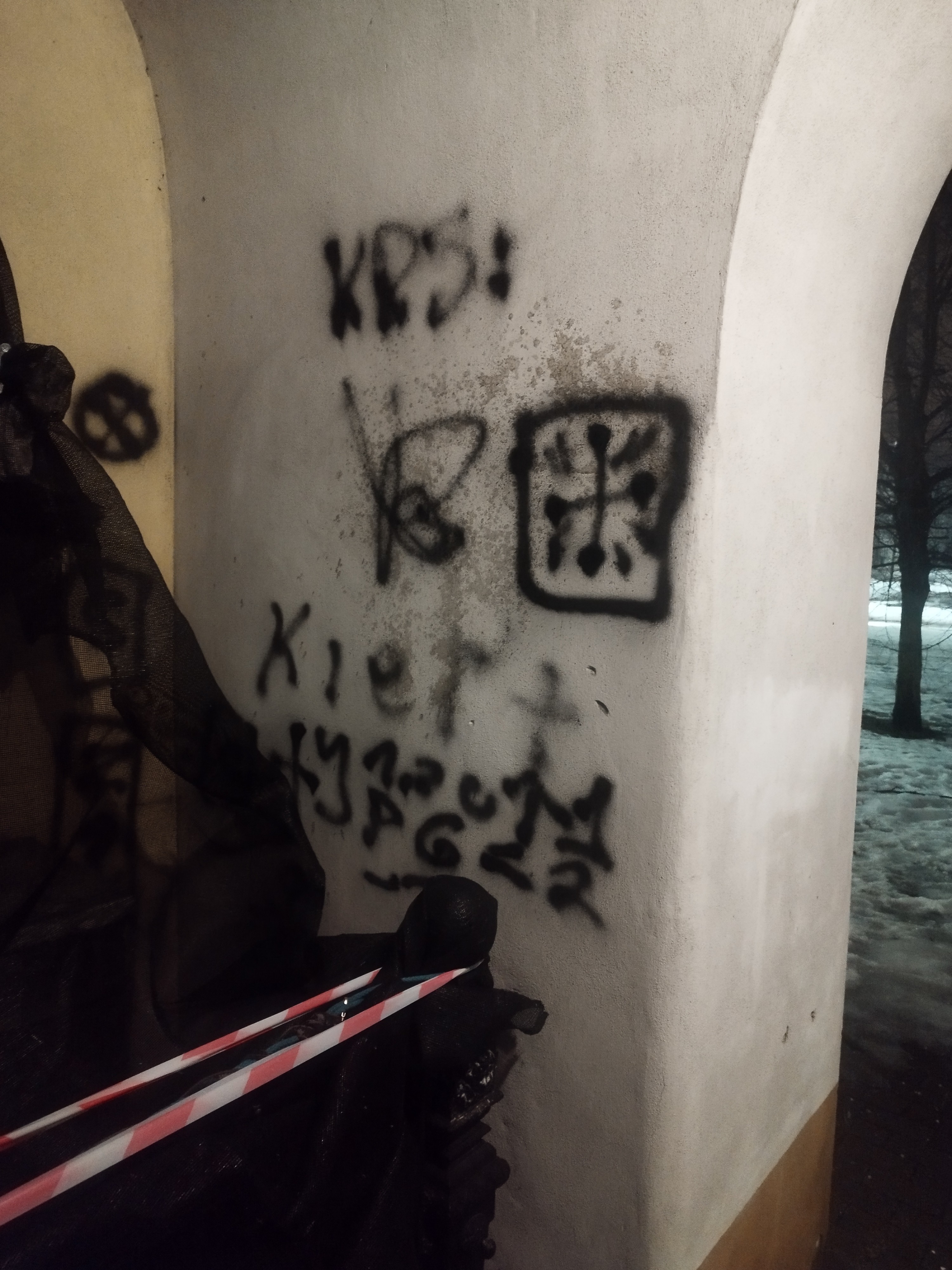 W trakcie dalszych czynności ustalono, że mężczyzna pojawił się w kaplicy już około godziny 20.00. Na ścianach obiektu umieścił napisy, między innymi „Zakaz” wraz ze znakiem drogowym, „Zabytki” oraz „KRS”. Farbą namalował także znak krzyża oraz swój podpis. Jak się okazało, po drodze miał również pomalować godła znajdujące się na ścianach budynków administracji publicznej.