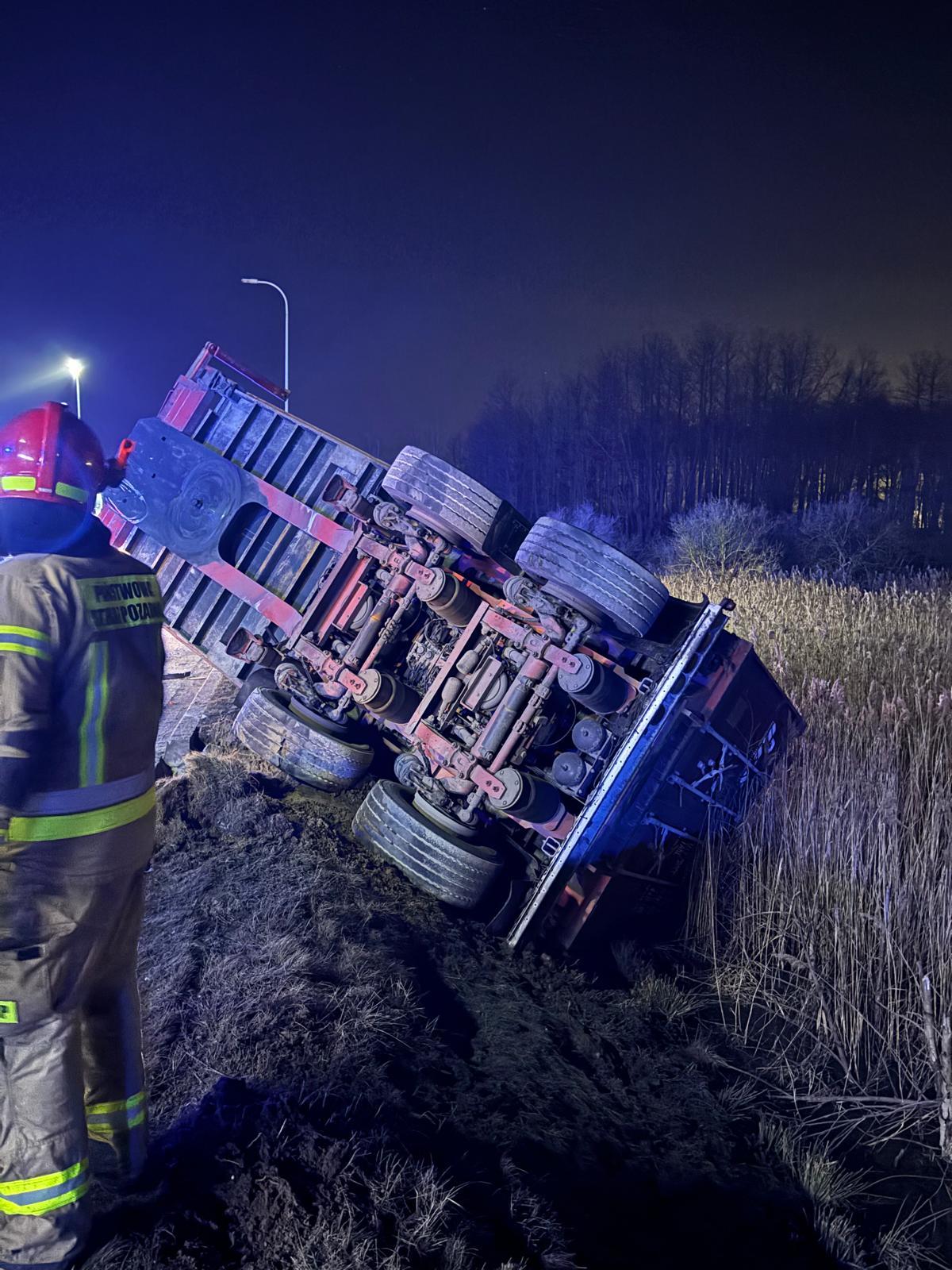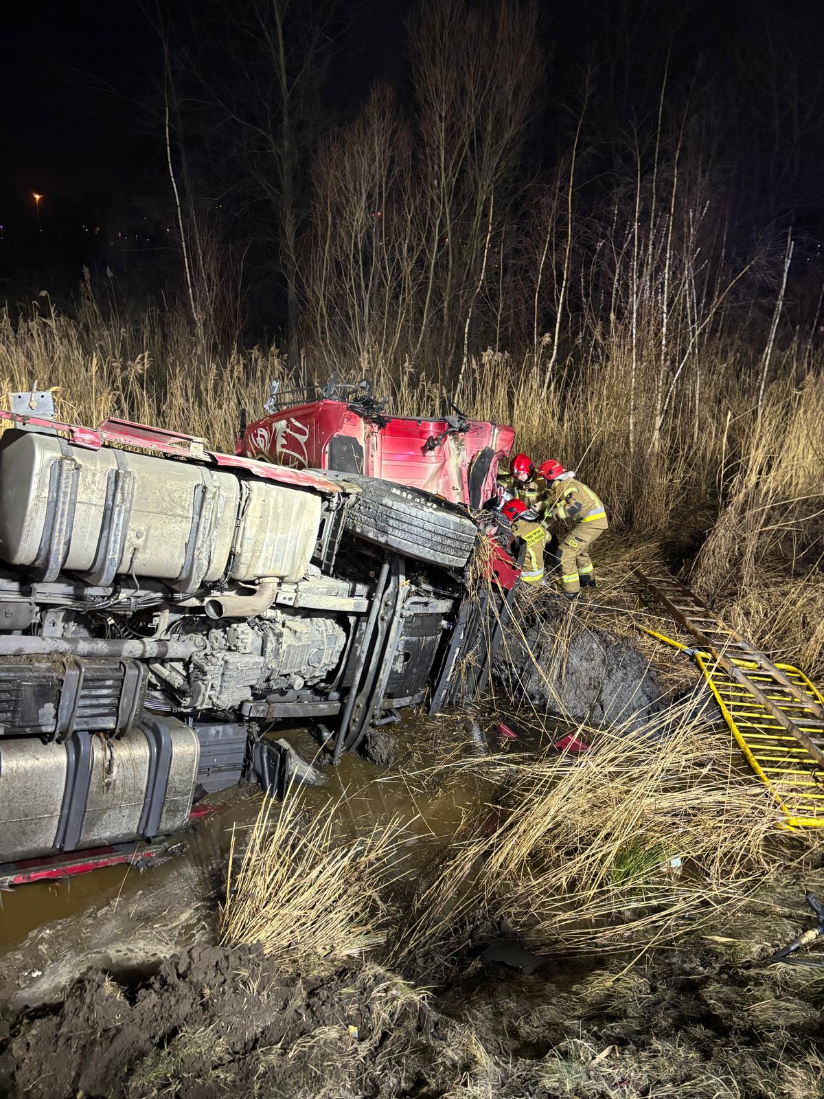 Jedna osoba została poszkodowana w wypadku ciężarówki. Na miejsce zdarzenia wysłano dziewięć pojazdów straży pożarnej.