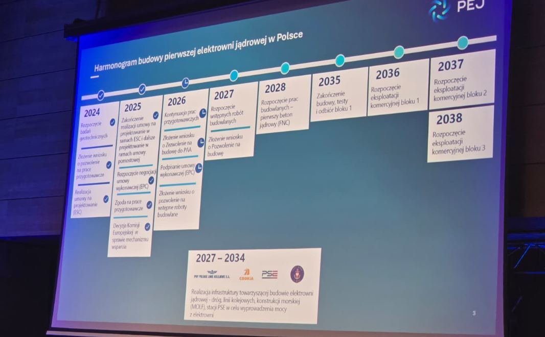 — W maju tego roku na placu budowy Polskich Elektrowni Jądrowych pojawią się maszyny i ciężki sprzęt od naszych partnerów, którzy odpowiedzialni są za tzw. infrastrukturę towarzyszącą. Będą oni realizować tzw. "ostatnią milę", czyli połączenie terenu elektrowni jądrowej z drogą krajową S6, oraz linie kolejowe – ważne nie tylko z punktu widzenia dojazdu do naszej inwestycji, ale także z perspektywy mieszkańców, którzy będą z nich korzystać na co dzień. Jeżeli wejdzie do polskiego systemu prawnego instytucja pn. Wstępne Roboty Budowlane, które zakładają głęboką ingerencję w teren, to po pozyskaniu pozwolenia od wojewody pomorskiej jeszcze w drugiej połowie tego roku mamy szansę je rozpocząć — mówił Marek Woszczyk, Prezes Zarządu Polskich Elektrowni Jądrowych.